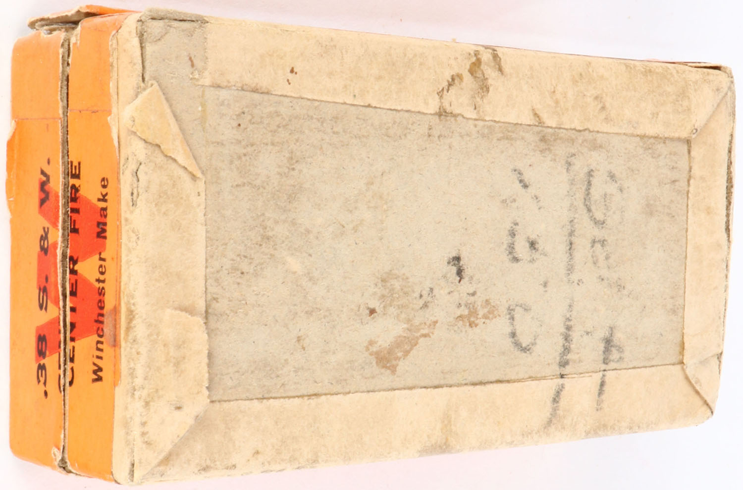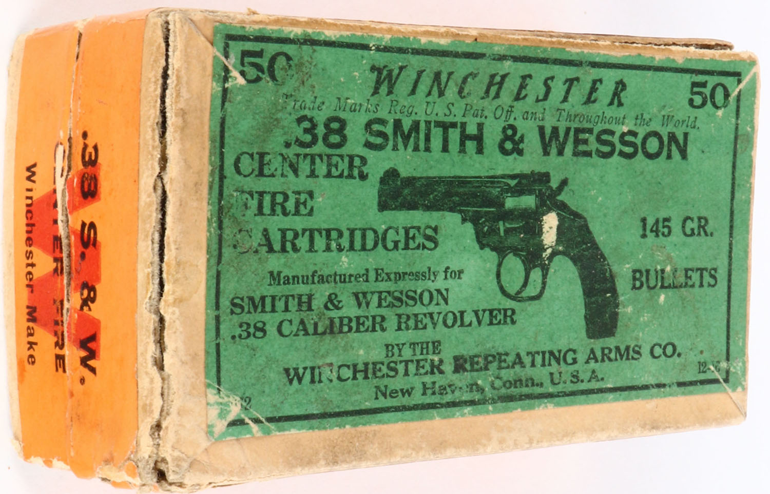 Winchester, .38 Smith & Wesson, 145 Gr. Bullets, Full, 2pc. Buff box with green top & orange side sealing labels, box is solid with excellent color, minor age soiling, left end and back side lip of lid is torn off, minor shelf wear, some edge & corner wear, labels are intact, ammo is excellent. Grade: Very Good - Value: 10 to 50