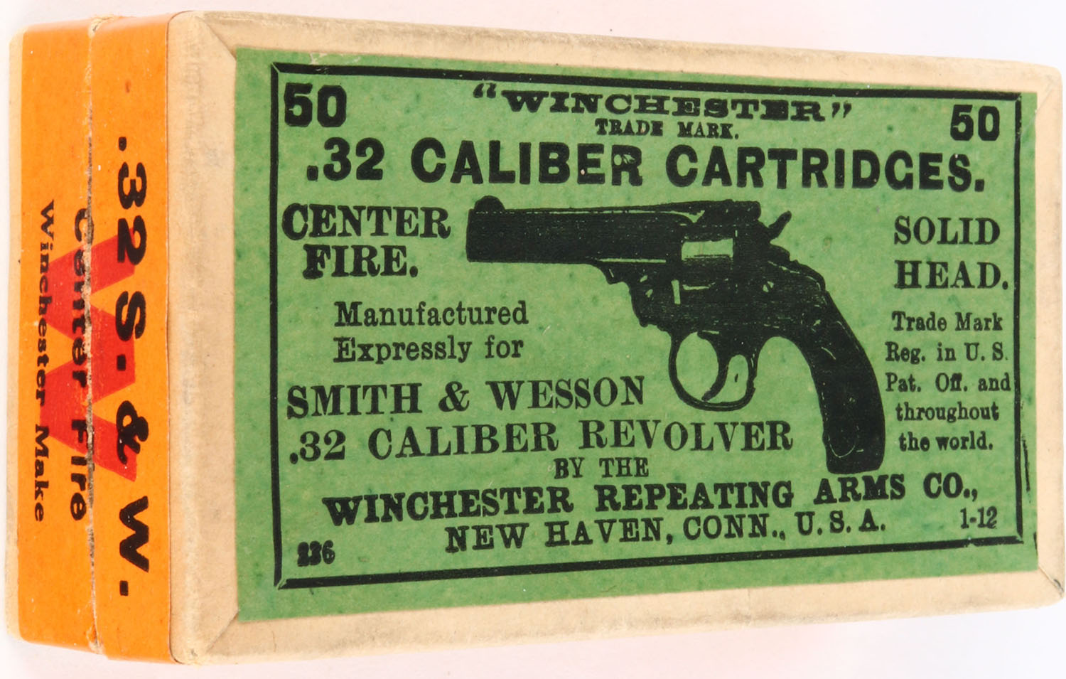 Winchester, .32 Smith & Wesson, Solid Head, Full, 2pc. Buff box with green top & orange side sealing labels, box is solid with minty color, corners are sharp, edges are crisp, labels are intact, ammo is good to very good. Grade: Excellent ++ - Value: 30 to 90
