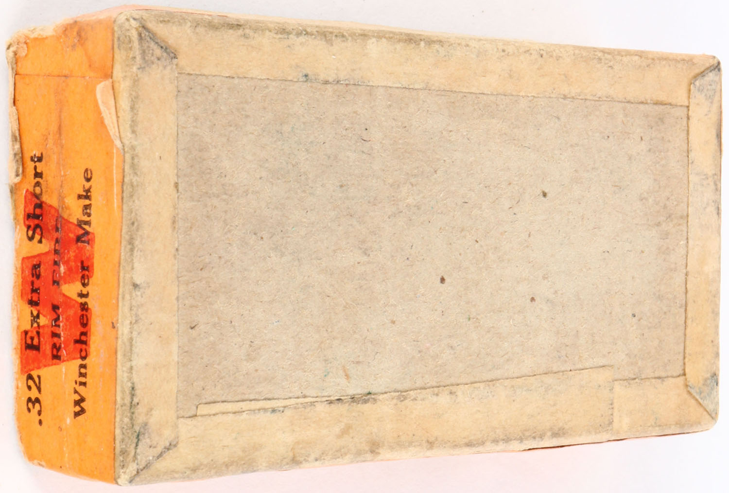 Winchester, .32 Extra Short Rim Fire, Full, 2pc. Buff box with green top & orange side sealing labels, box is sealed but has 2 seam splits to back side and right edges of lid, excellent color, very minor age soiling, some shelf wear, lid is creased diagonally, edge & corner wear, ammo is good. Grade: Very Good - Value: 100 to 1000
