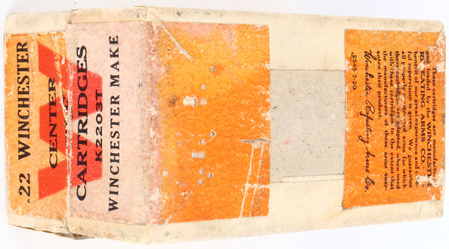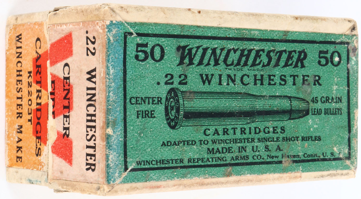 Winchester, .22 Winchester Center Fire, 45 Grain Lead Bullets, Full, 2pc. Buff box with green & orange wraparound label, box is solid with very good to excellent color, some color fading to ends, minor shelf wear, vertical seam splits to both left end corners of lid, minor edge & corner wear, ammo is mostly excellent. Grade: Very Good ++ - Value: 50 to 200