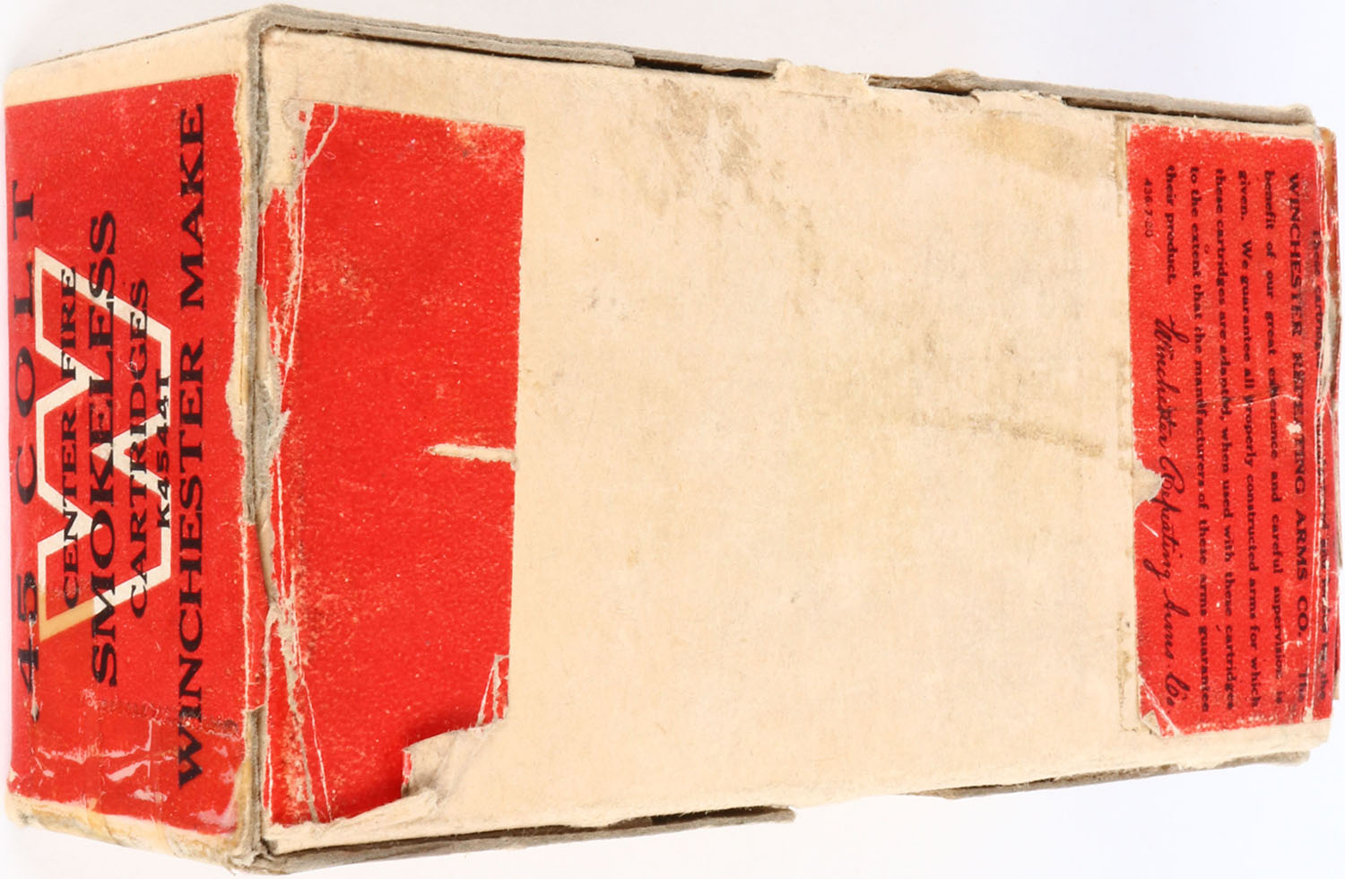 Winchester, Smokeless Cartridges, .45 Colt, 255 Grain Lead Bullets, Partial 36rds. Correct, 2pc. Buff box with red wraparound label, box is solid with excellent color, very minor shelf wear, some edge & corner wear, tape on front and back side of lid, label is intact, ammo is good to very good. Grade: Excellent - Value: 30 to 90
