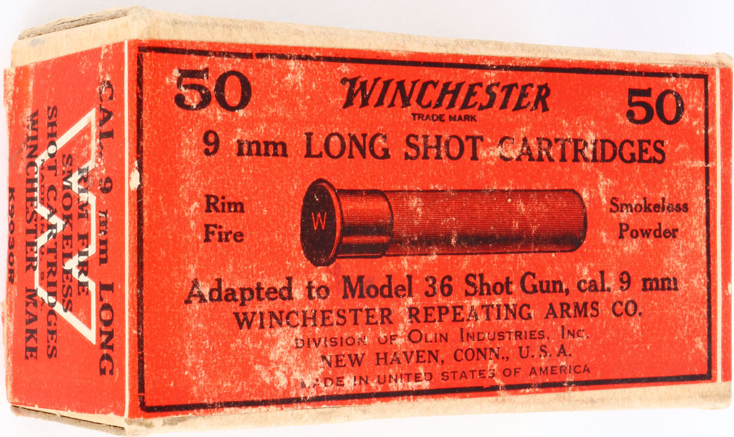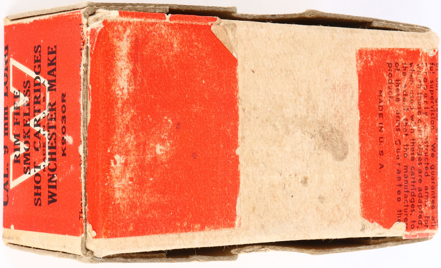 Winchester, 9mm Long Shot Cartridges, Rim Fire, Full, 2pc. Buff box with red wraparound label, box is solid with excellent color, some shelf wear, minor corner wear, edges are mostly crisp, label is intact, ammo is excellent. Grade: Excellent + - Value: 100 to 300