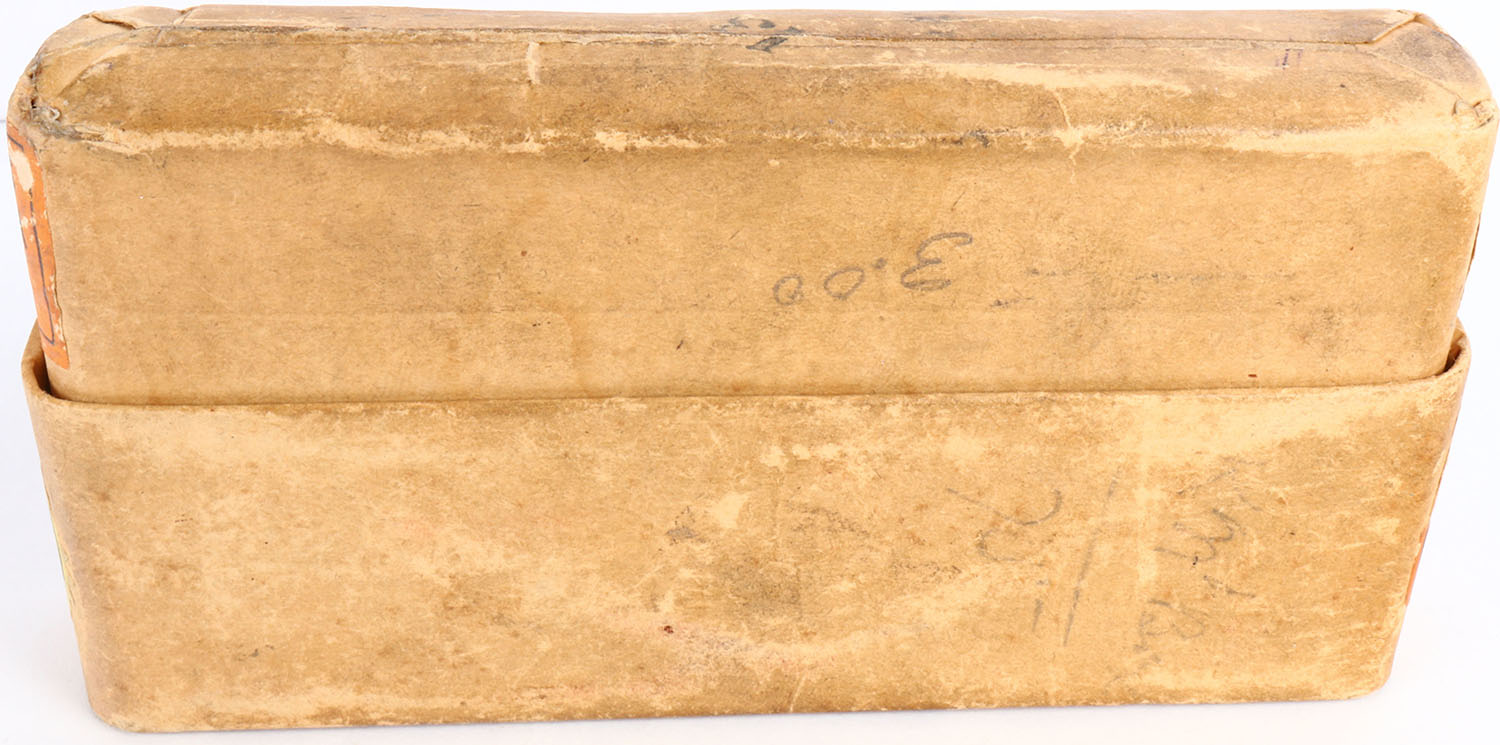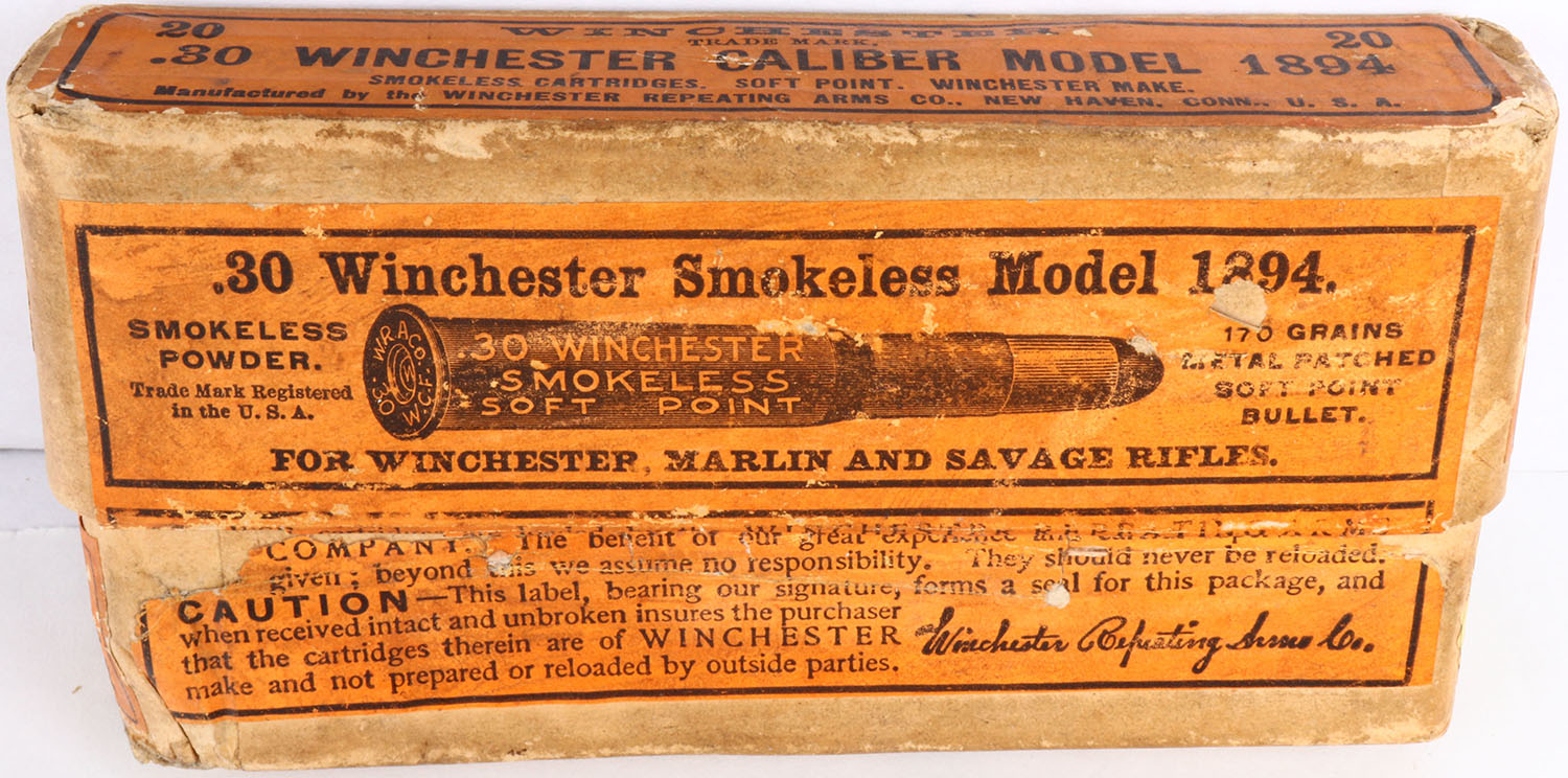 Winchester, .30 W.C.F. (.30-30), Smokeless, 170 Grains Metal Patched Soft Point Bullet, Full, 1pc. Buff box with orange labels, box is solid with excellent color, some age soling, some edge and corner wear, labels are intact, back has been written on, ammo is excellent. Grade: Very Good + - Value: 30 to 90