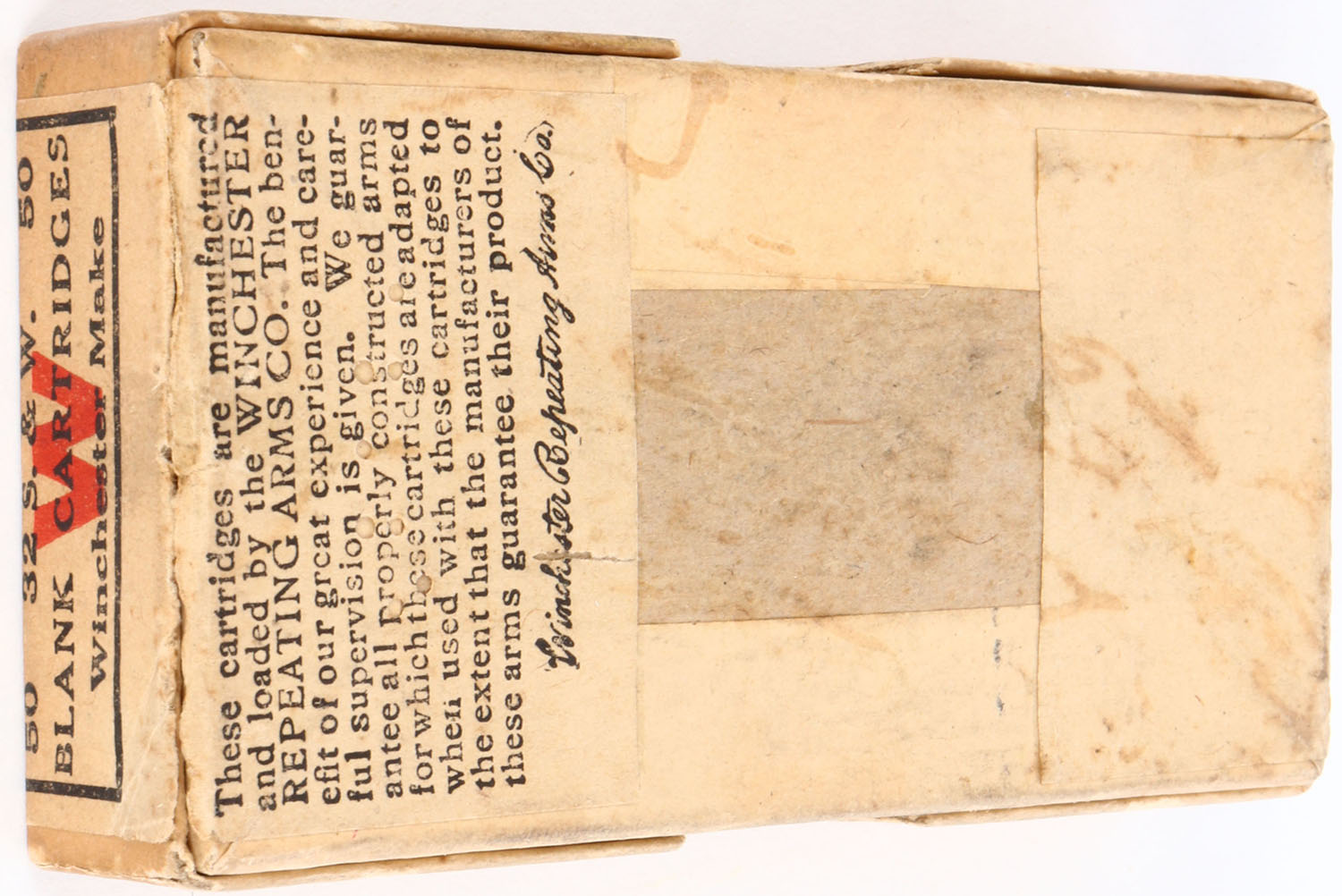 Winchester, .32 Smith & Wesson, Blank Cartridges, Full of incorrect ammo, 2pc. Buff box with buff wraparound label, box is solid with excellent color, very minor age soiling, some staining, very minor edge & corner wear, label is intact, ammo is excellent. Grade: Excellent - Value: 8 to 40