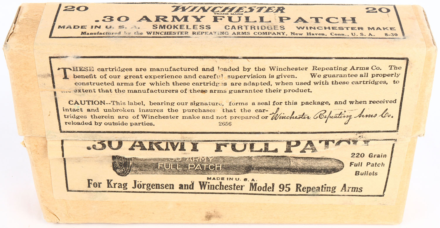 Winchester, .30 Army (.30-40 Krag), 220 Grain Full Patch Bullets, Full of incorrect ammo (W.R.A. H/S, No ''W'' on primer, copper plated round nose) 2pc. Buff box with buff label, box is solid with excellent color, very minor edge & corner wear, label is intact, ammo is excellent. Grade: Excellent + - Value: 20 to 60