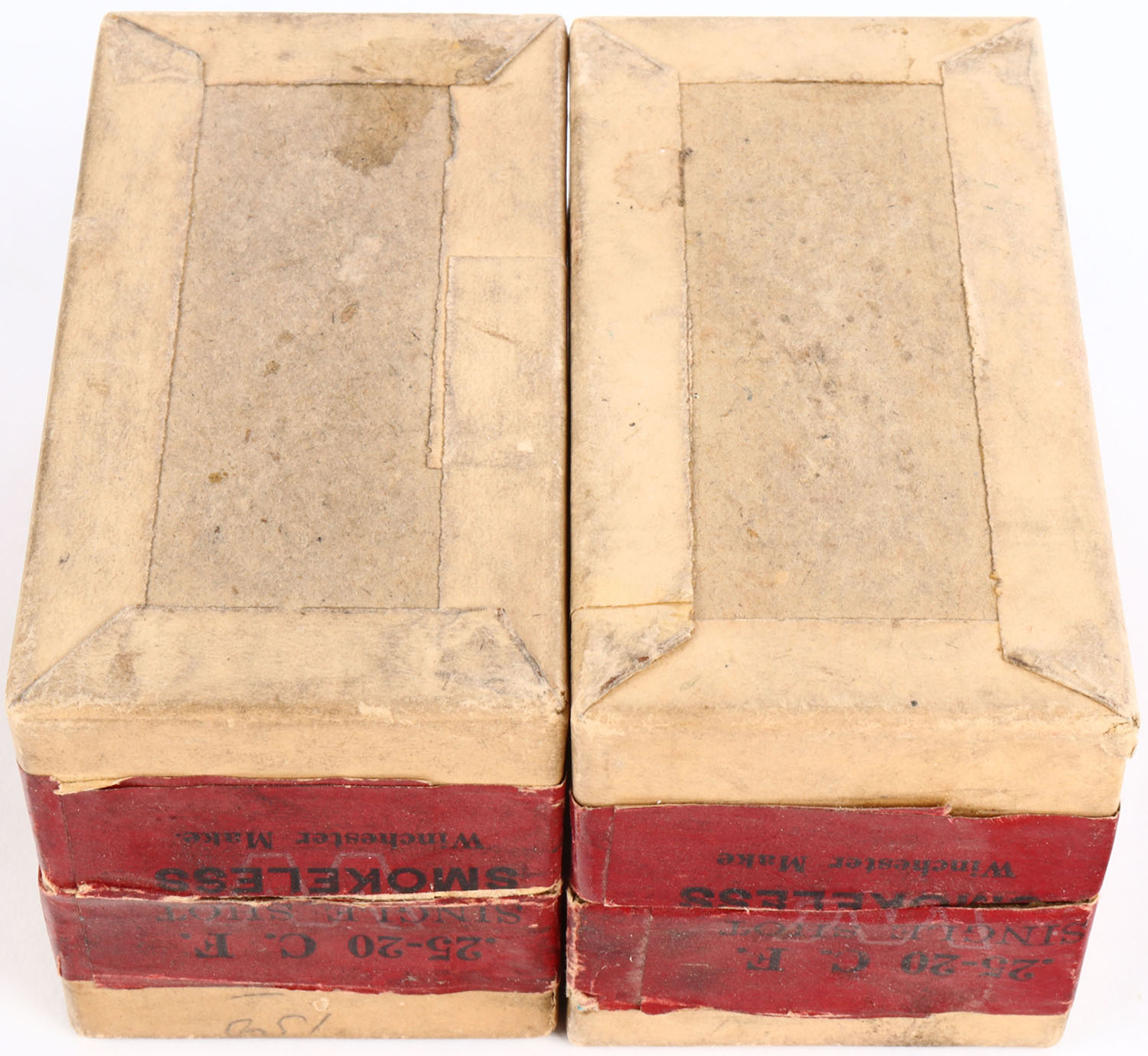 Winchester, lot of (2), .25-20 Single Shot, Smokeless, both boxes empty, 2pc. Buff boxes with red top & side sealing labels, boxes are solid with very good to excellent color, some age soiling & shelf wear, minor edge & corner wear, labels are intact. Grade: Excellent - Value: 6 to 60
