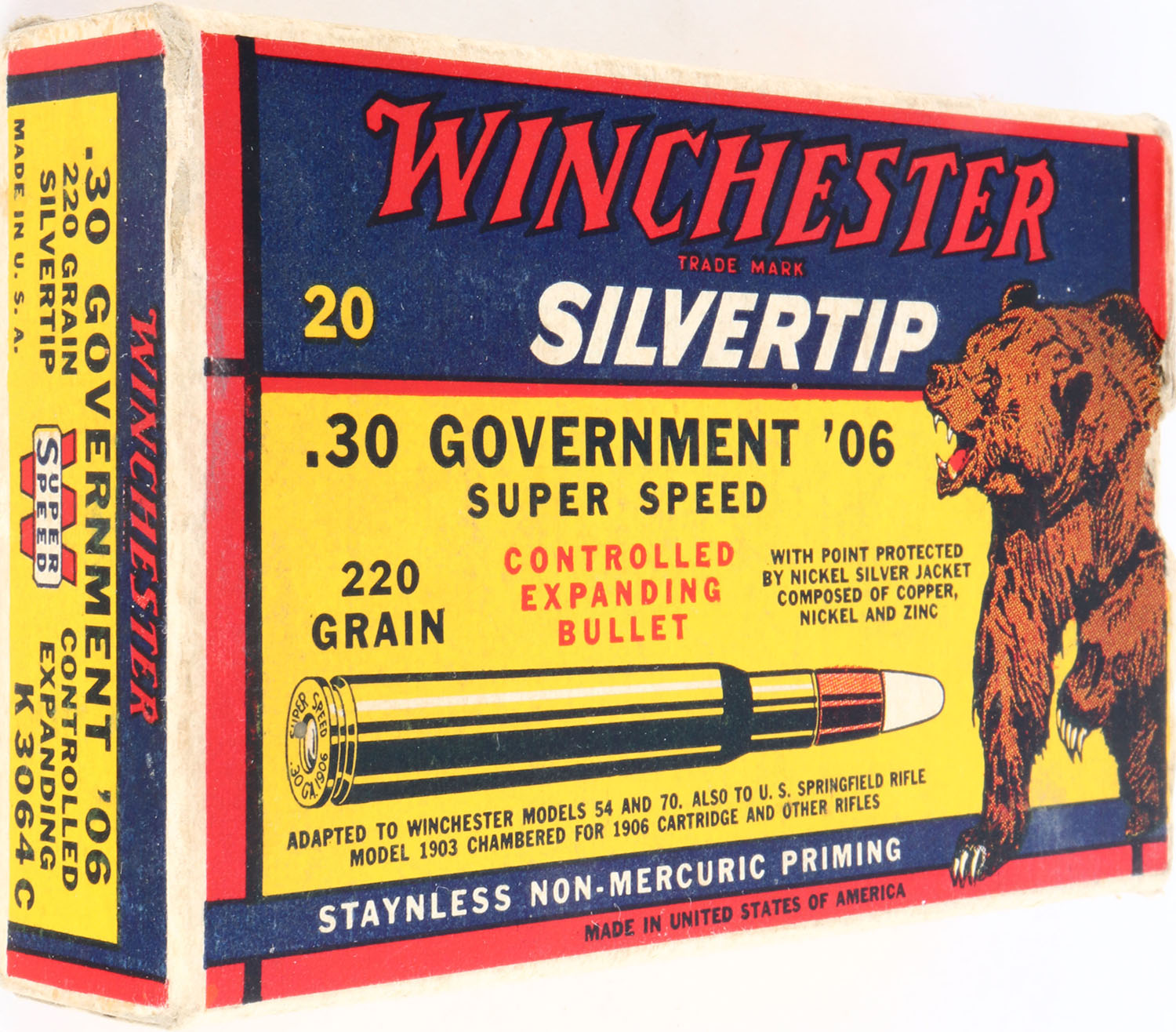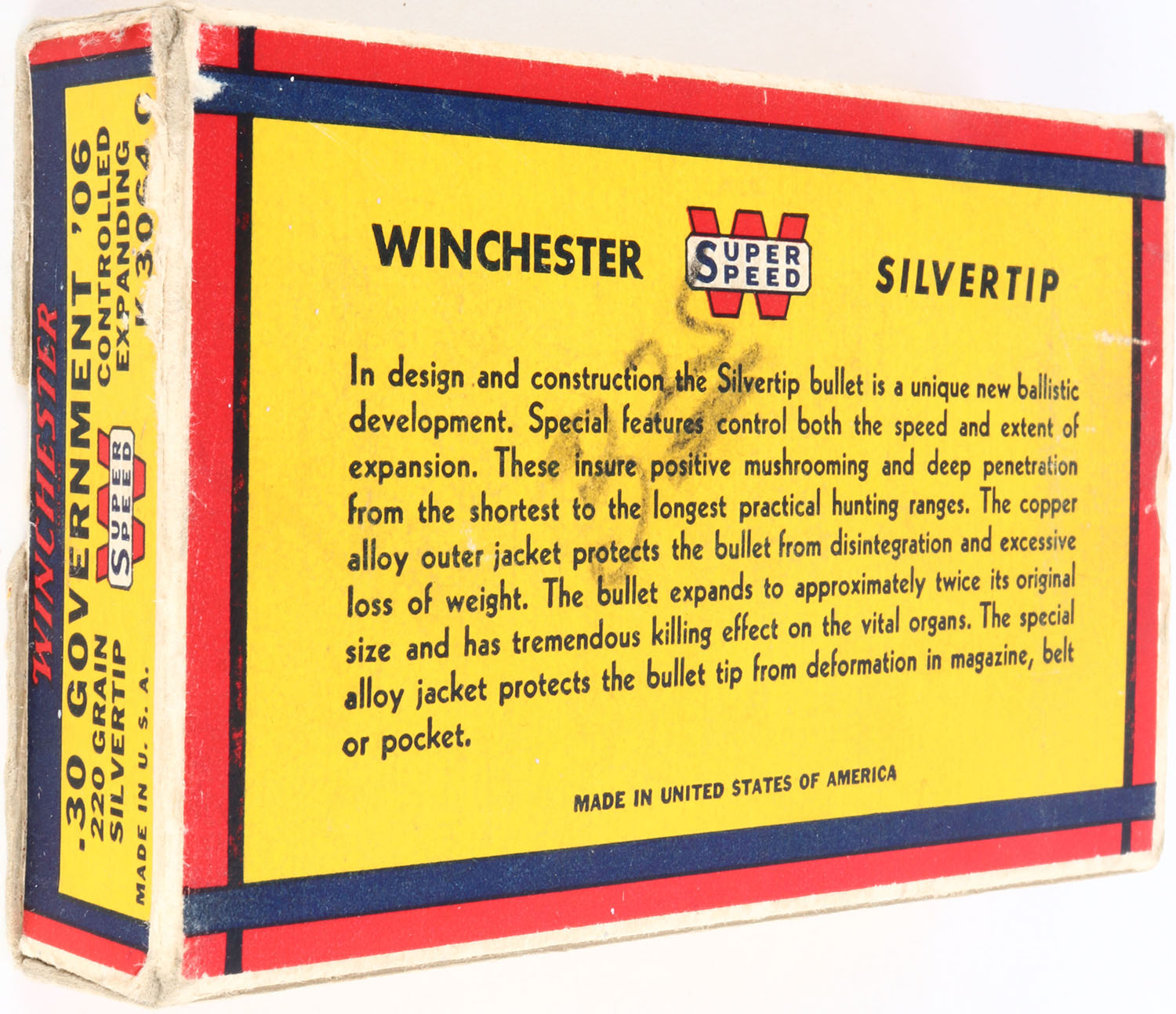 Winchester, Silvertip, .30 Government '06 (.30-06), 220 Grain Controlled Expanding Bullet, Full, 1pc. Yellow blue & red bear box, box is solid with excellent color, very minor age soiling, minor corner wear, edges are mostly crisp, end flaps are solid, ammo is excellent. Grade: Excellent + - Value: 20 to 60