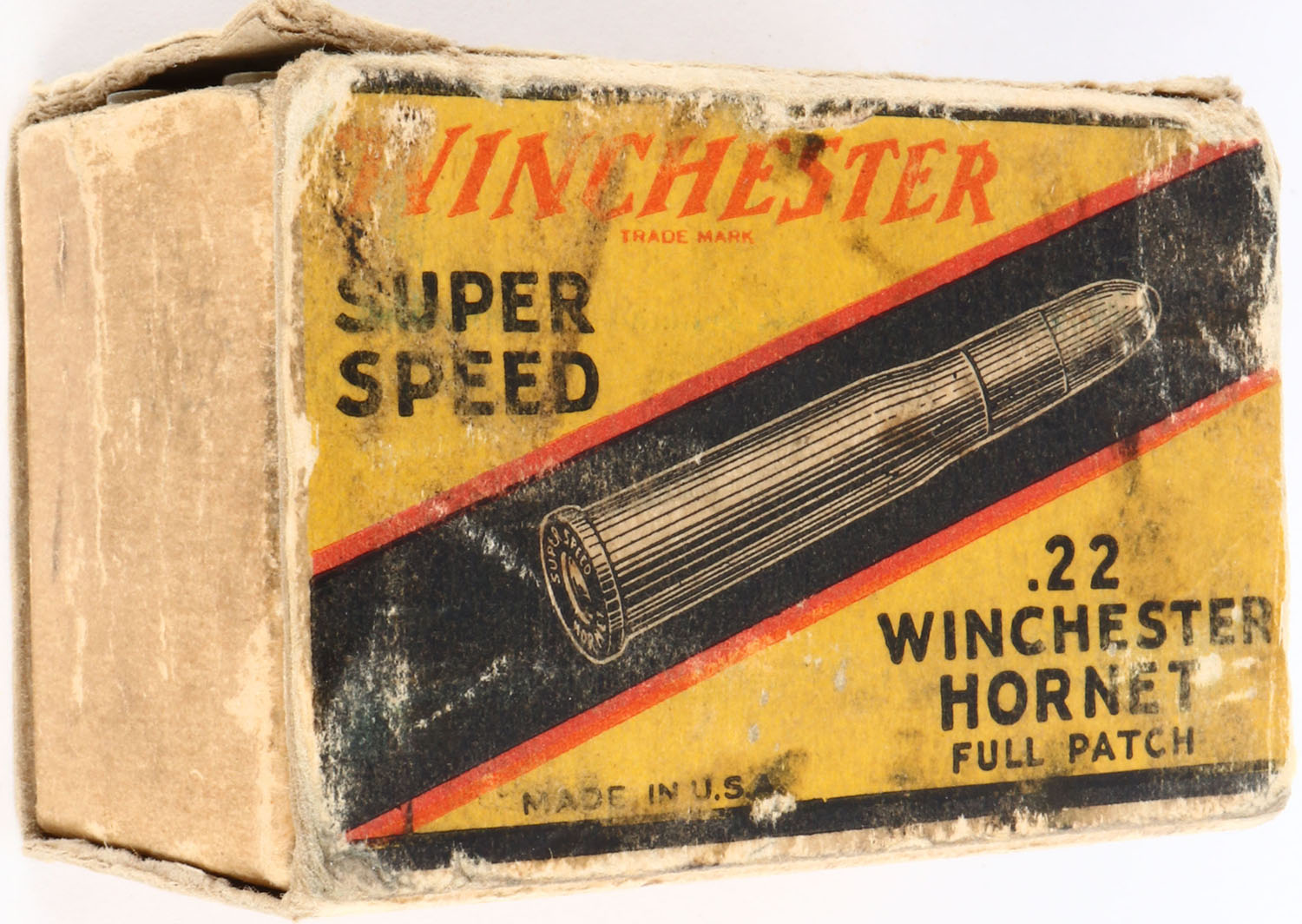 Winchester, Super Speed, .22 Hornet, Non-Mercuric Staynless, 46 Grain Full Patch, Full, 1pc. Yellow red & blue box, box is missing both end flaps, good to very good color, age soiling, some color fading & shelf wear, edge & corner wear, ammo is excellent. Grade: Good ++ - Value: 30 to 400