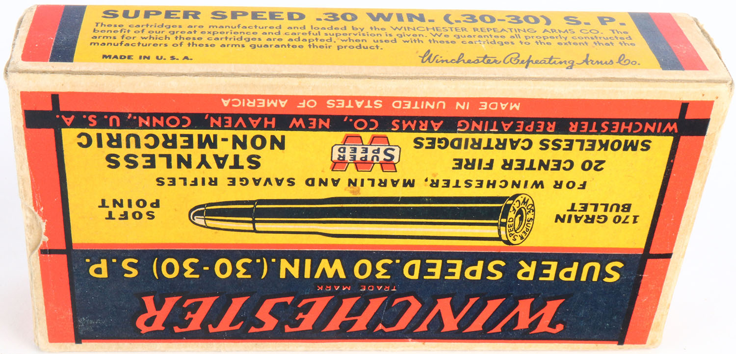 Winchester, Super Speed, .30 Winchester (.30-30), 170 Grain Soft Point Bullet, Partial 16rds. 1pc. Yellow blue & red box, box is solid with excellent color, very minor age soiling & shelf wear, minor corner wear, edges are mostly crisp, end flaps are solid, ammo is excellent. Grade: Excellent - Value: 10 to 50