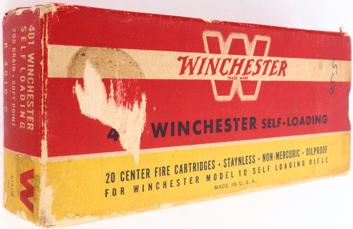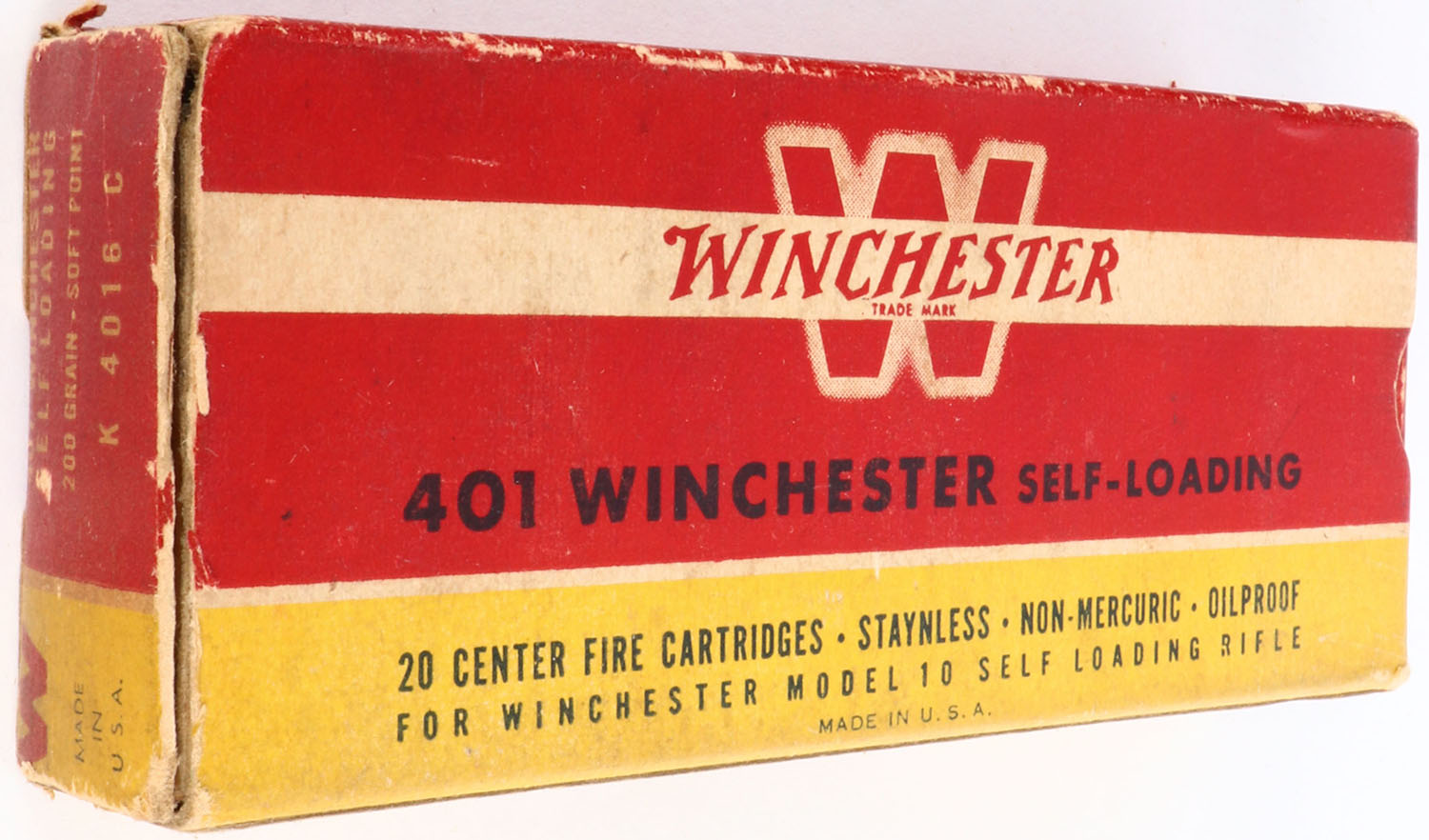 Winchester, .401 Winchester Self-Loading, 200 Grain Soft Point, Full, 1pc. Redd yellow & white box, right end flap is torn, very good to excellent color, some age soiling, stain & scuff to top, top has been written on, some edge & corner wear, left end flap is solid, ammo is excellent. Grade: Very Good + - Value: 30 to 90