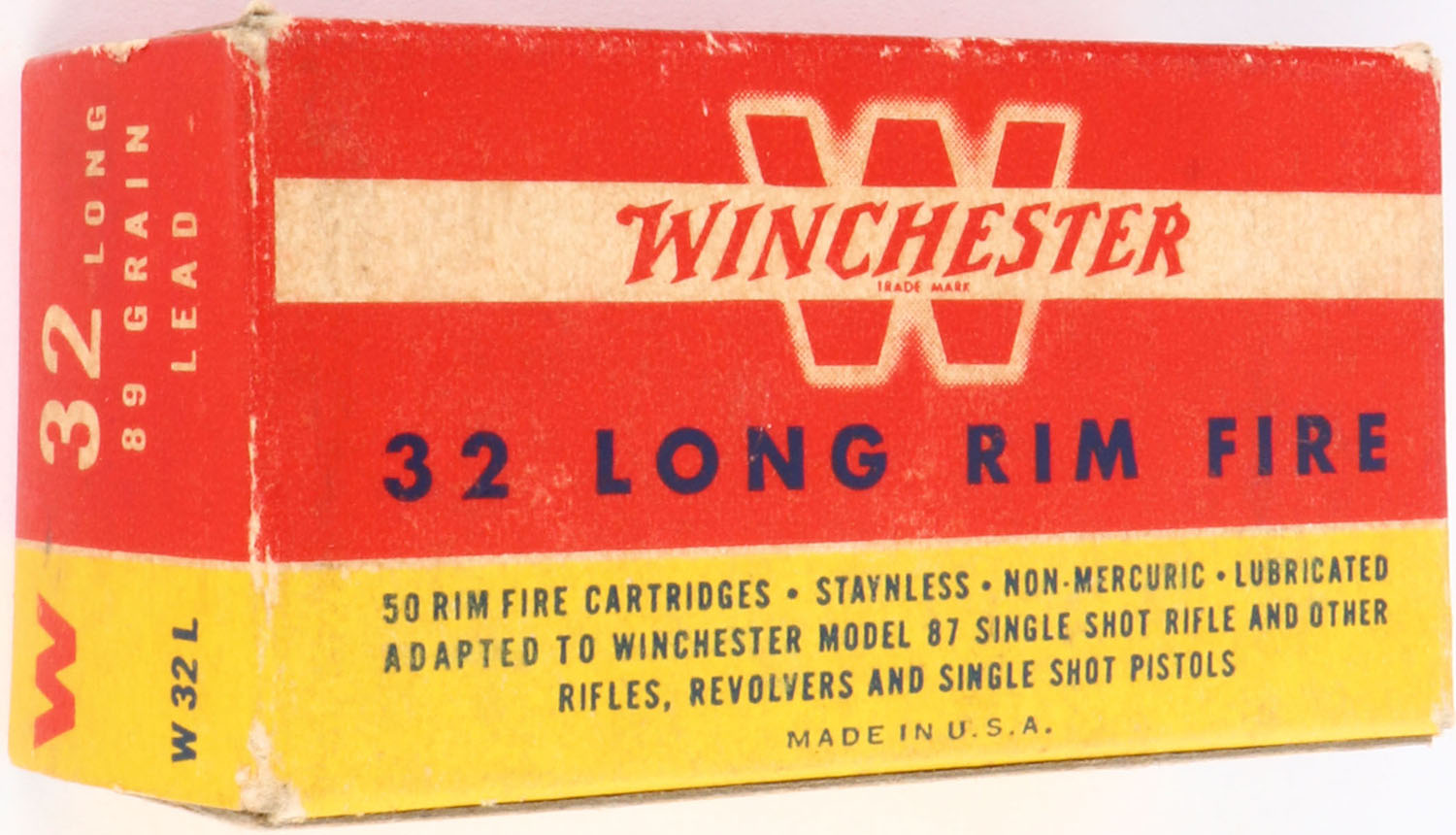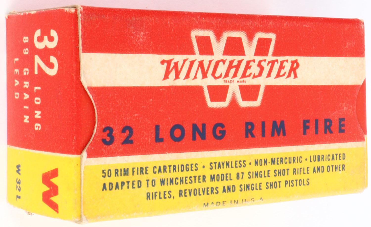 Winchester, .32 Long Rim Fire, 89 Grain Lead Bullet, Full, 1pc. Red yellow & white box, box is solid with excellent color, very minor corner wear, edges are mostly crisp, end flaps are solid, ammo is excellent. Grade: Excellent + - Value: 50 to 150