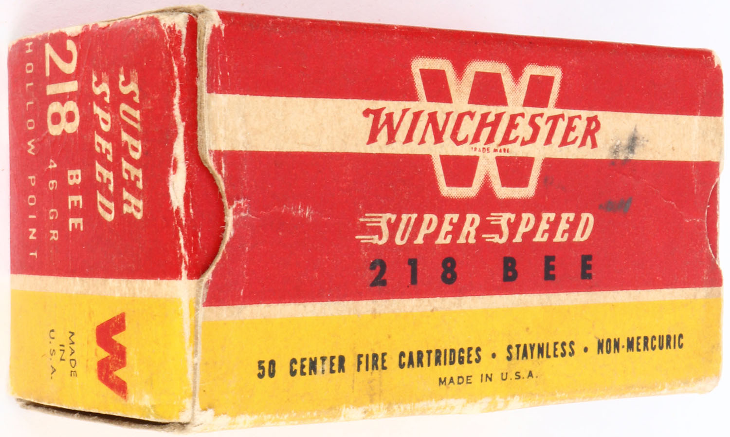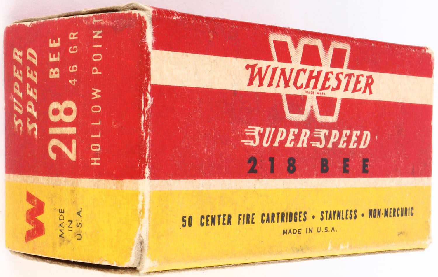 Winchester, Super Speed, .218 Bee Hollow Point, 46 Grain, Full, 1pc. Red yellow & white box, box is solid with very good to excellent color, some age soiling, minor edge & corner wear, end flaps are solid, ammo is excellent. Grade: Excellent - Value: 100 to 200