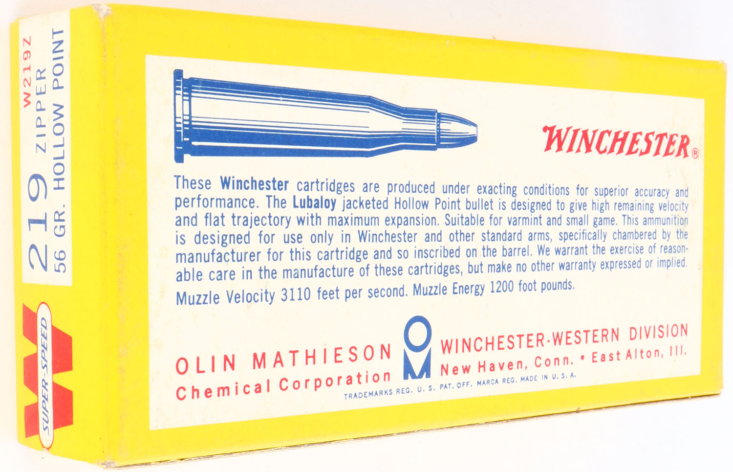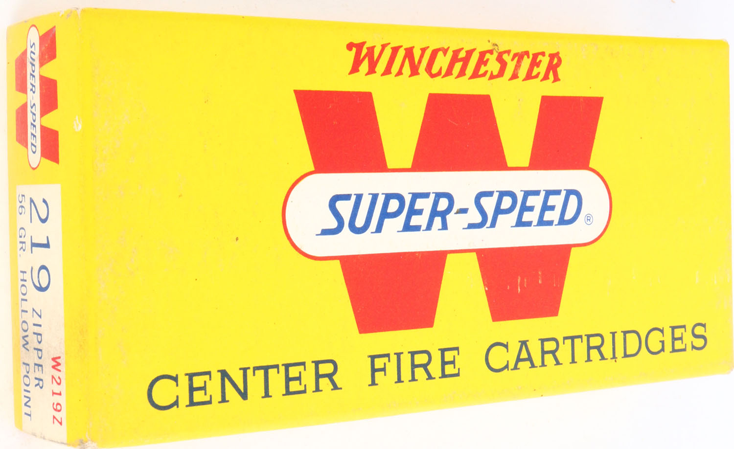 Winchester, Super-Speed, .219 Zipper Hollow Point, 56 Grain, Full, 1pc. Yellow white & red box, box is solid with excellent to minty color, minor shelf wear, corners are mostly sharp, edges are crisp, end flaps are solid, ammo is excellent. Grade: Excellent ++ - Value: 150 to 300