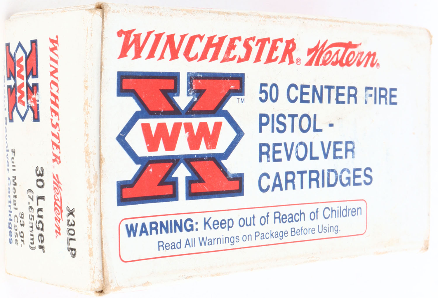 Winchester-Western, .30 Luger (7.65mm), 93 Grain Full Metal Case, Full, 1pc. White box, box is solid with excellent color, minor age soiling & shelf wear, some corner wear, very minor edge wear, end flaps are solid, ammo is excellent. Grade: Excellent - Value: 10 to 40