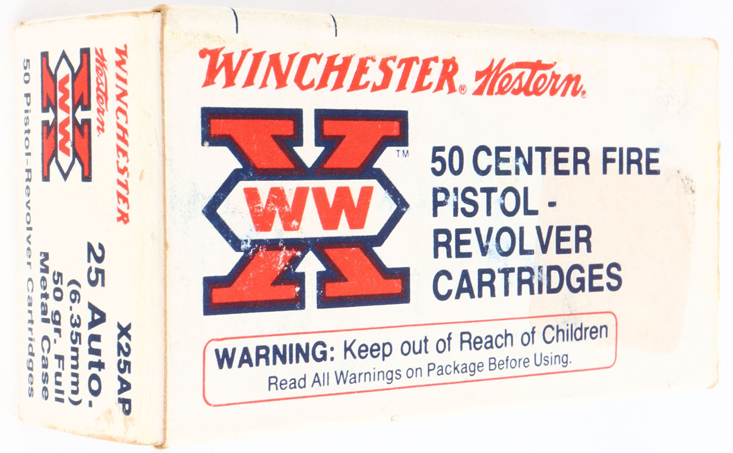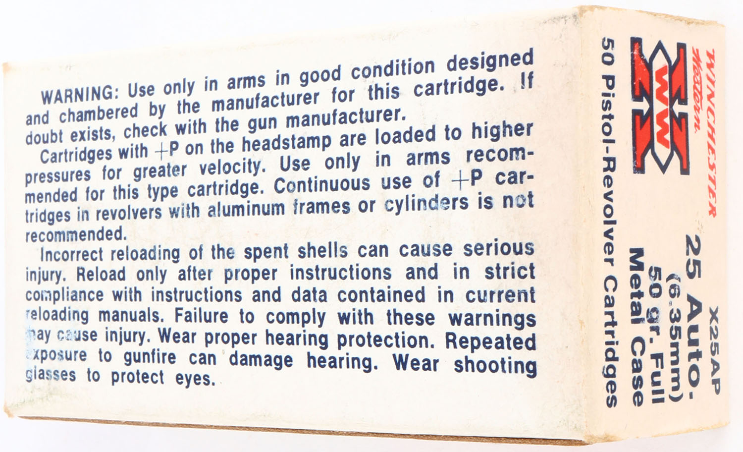 Winchester-Western, X, .25 Auto. (6.35mm), 50 Grain Full Metal Case, Partial 49rds., 1pc. White box, box is solid with excellent color, minor shelf wear, very minor corner wear, edges are crisp, end flaps are solid, ammo is excellent. Grade: Excellent - Value: 8 to 40
