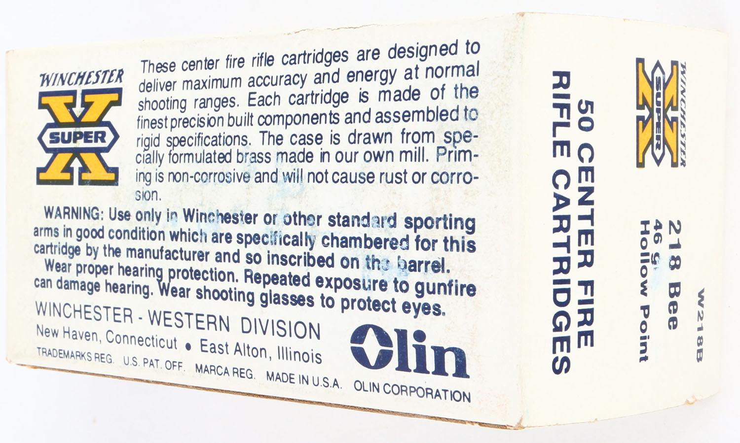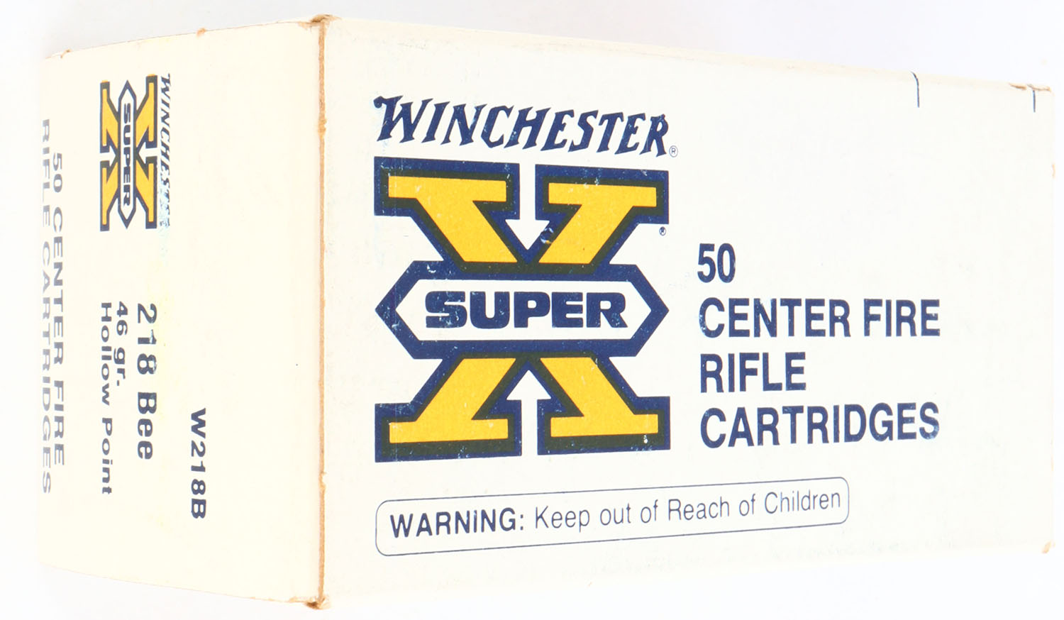 Winchester, Super X, .218 Bee, 46 Grain Hollow Point, Full, 1pc. White box, box is solid with excellent color, very minor shelf wear, corners are mostly sharp, edges are crisp, end flaps are solid, ammo is excellent. Grade: Excellent + - Value: 50 to 150