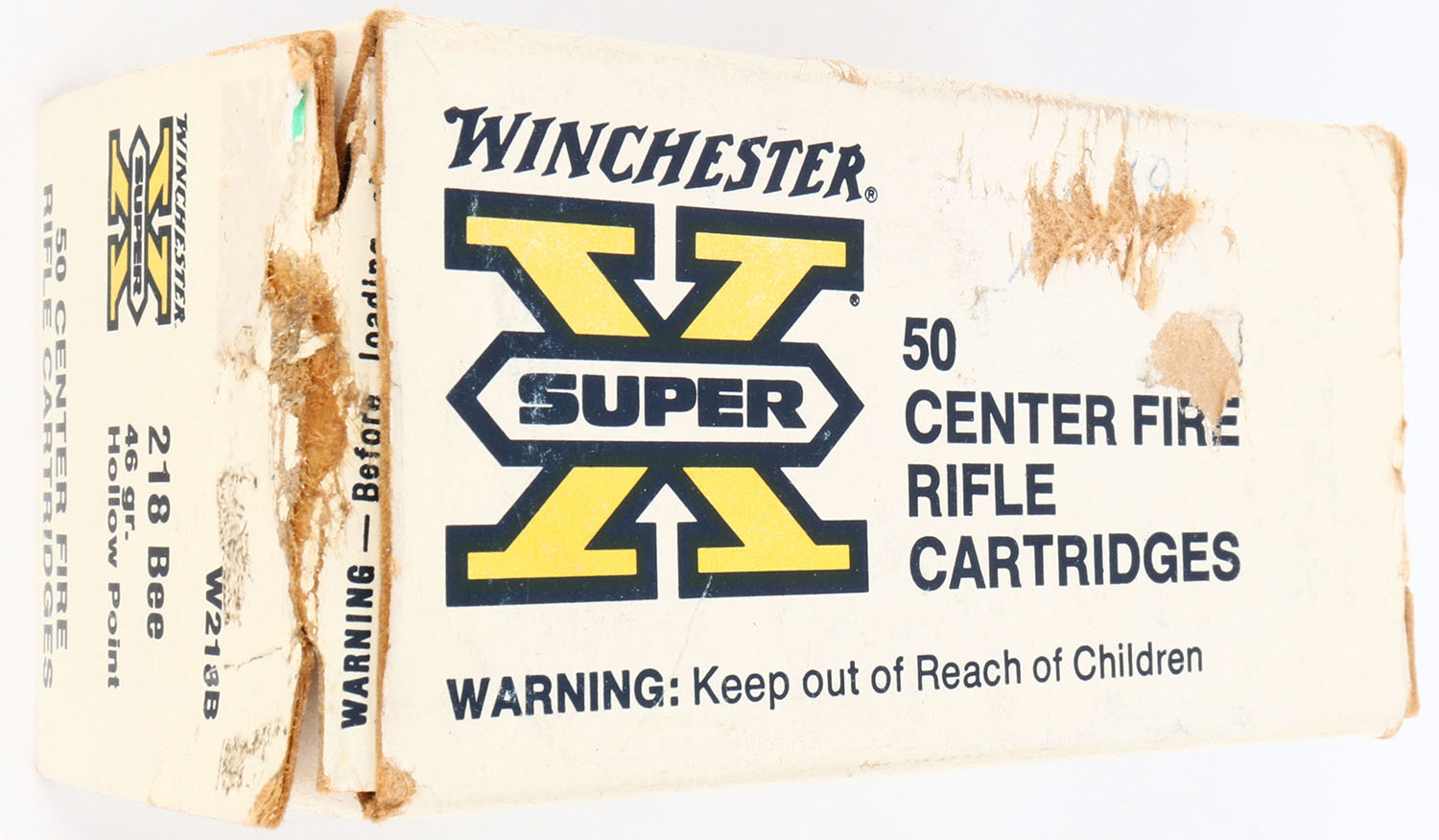 Winchester, Super X, .218 Bee, 46 Grain Hollow Point, Full, 1pc. White box, box is solid with very good to excellent color, minor color fading, shelf wear, some edge & corner wear, end flaps are solid, ammo is excellent. Grade: Very Good ++ - Value: 40 to 120