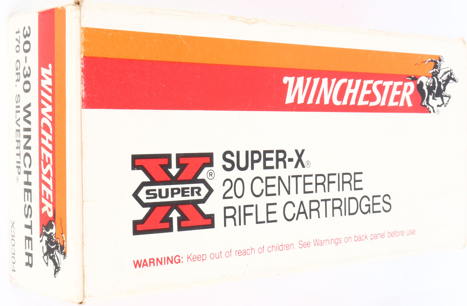 Winchester, Super-X, .30-30 Winchester, 170 Grain Silvertip, Full, 1pc. Gray red & orange box, box is solid with excellent color, very minor age soiling, very minor edge & corner wear, end flaps are solid, ammo is excellent. Grade: Excellent + - Value: 10 to 50