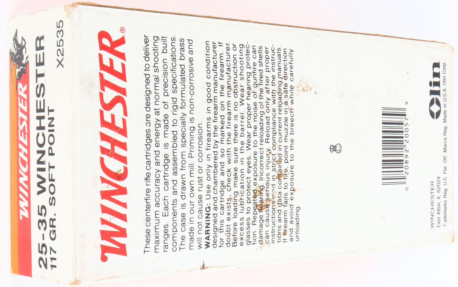 Winchester, Super-X, .25-35 Winchester, 117 Grain Soft Point, Full, 1pc. Gray red & orange box, box is solid with excellent color, minor shelf & corner wear, edges are mostly crisp, end flaps are solid, top has been written on, ammo is excellent. Grade: Excellent. - Value: 40 to 120