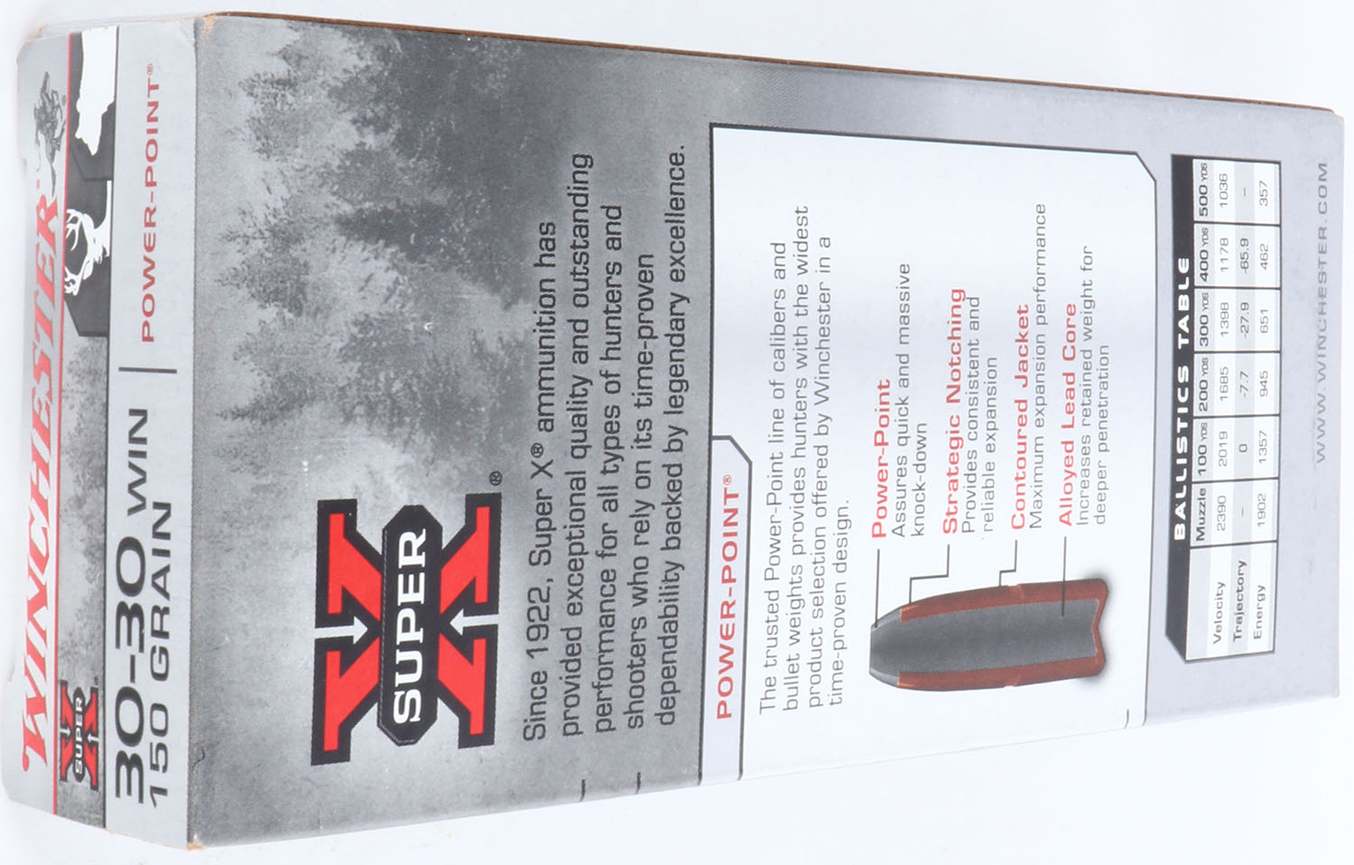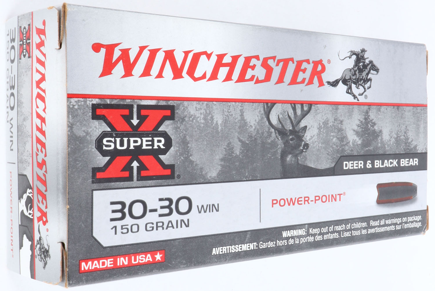 Winchester, Super X, .30-30 Winchester, 150 Grain Power Point, Full, 1pc. Silver & red box, box is MINT with minty color, corners are sharp, edges are crisp, end flaps are solid, ammo is excellent. Grade: MINT - Value: 10 to 40
