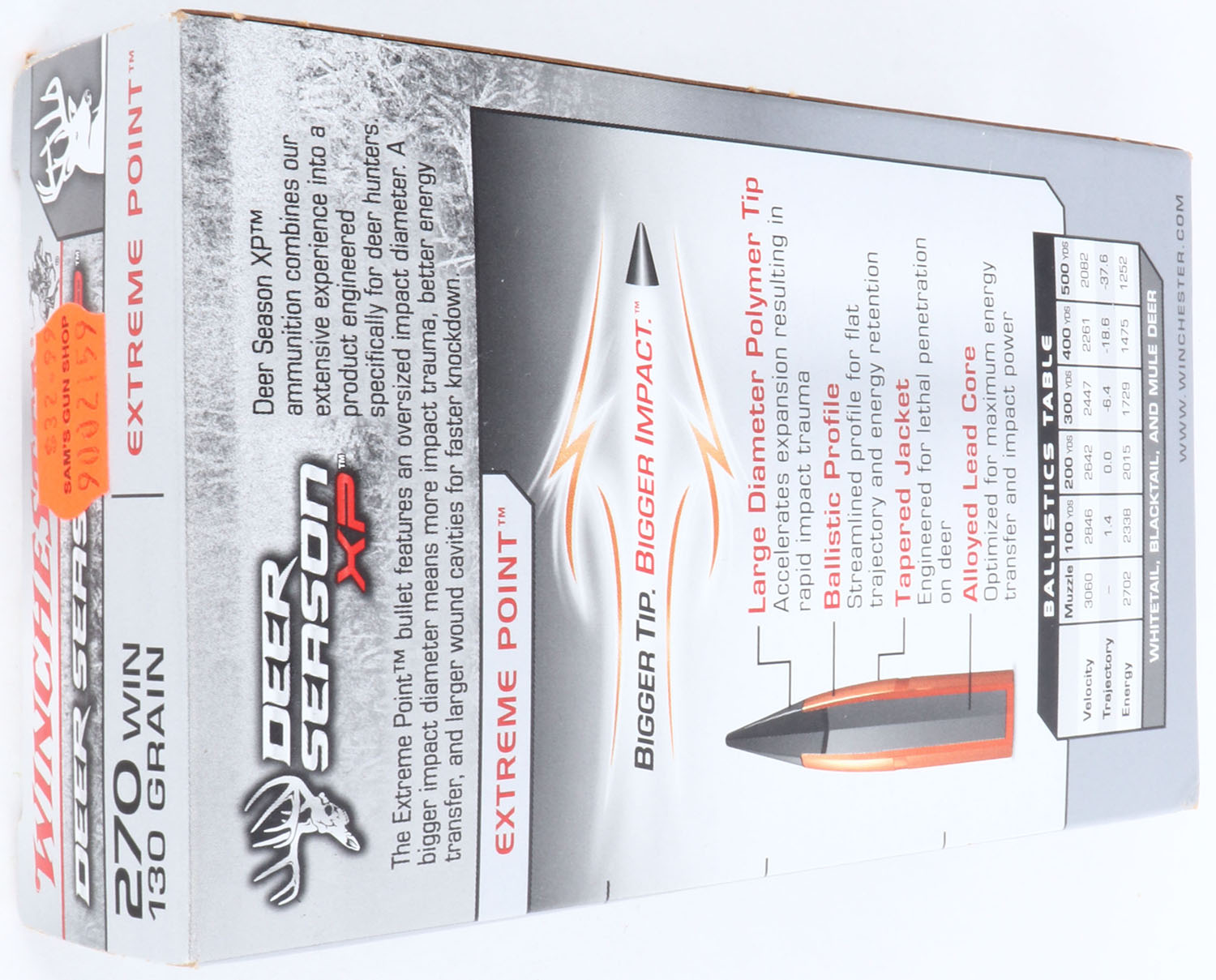 Winchester, Deer Season XP, .270 Winchester, 130 Grain Extreme Point, Full, 1pc. Gray & red box, box is MINT with minty color, corners are sharp, edges are crisp, end flaps are solid, ammo is excellent. Grade: MINT - Value: 10 to 40
