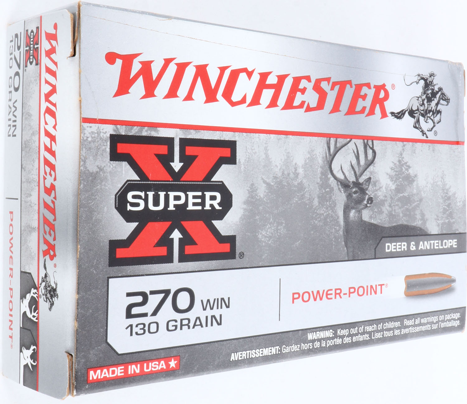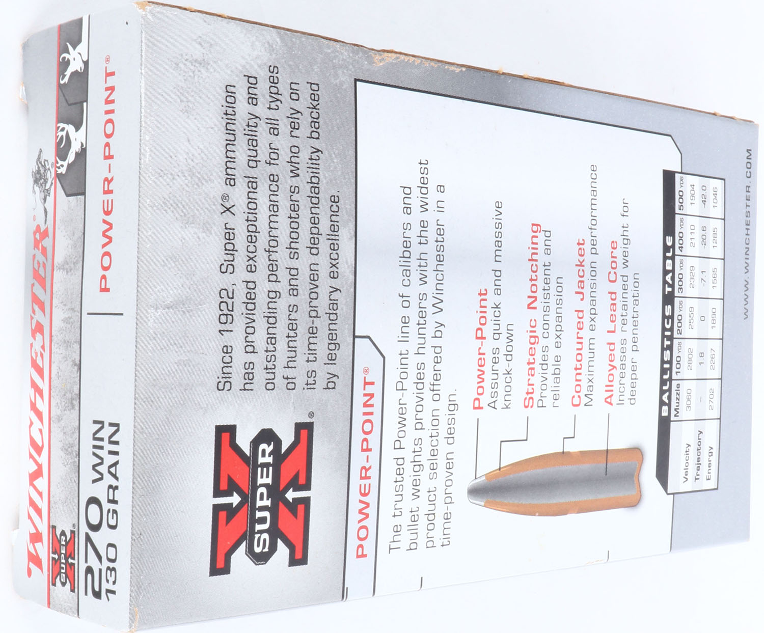 Winchester, Super-X, .270 Winchester, 130 Grain Power-Point, Full, 1pc. Gray & red box, box is solid with minty color, minor corner wear, edges are crisp, end flaps are solid, ammo is excellent. Grade: Excellent ++ - Value: 10 to 40