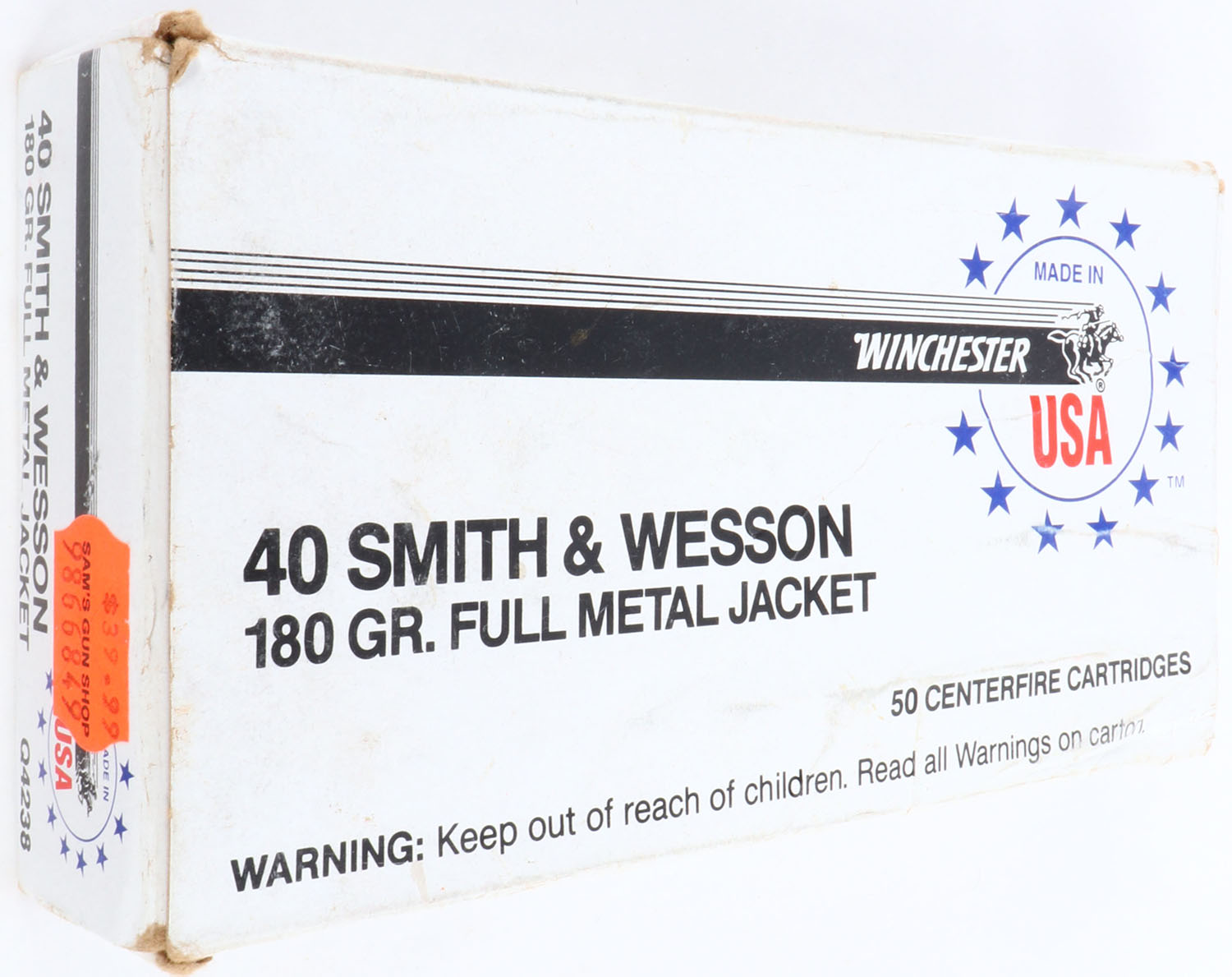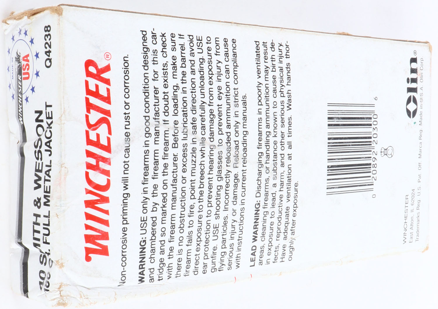 Winchester, .40 Smith & Wesson, 180 Grain Full Metal Jacket, Full, 1pc. White & black box, box is solid with excellent color, box appears to have been dropped, edge & corner wear, end flaps are solid, ammo is excellent. Grade: Very Good + - Value: 10 to 40