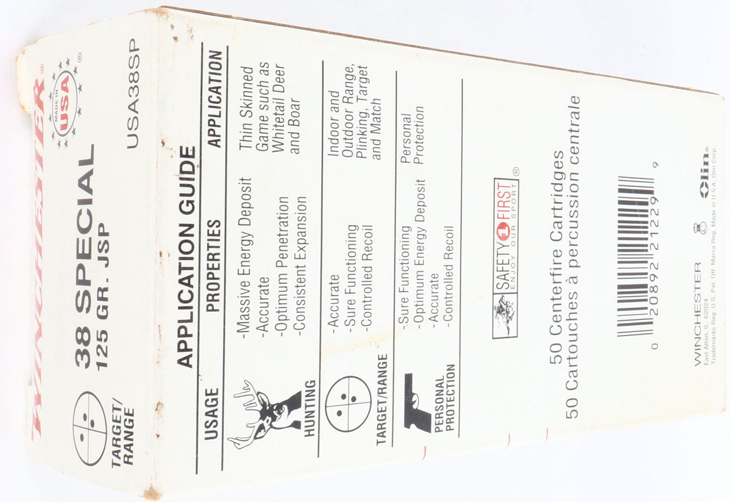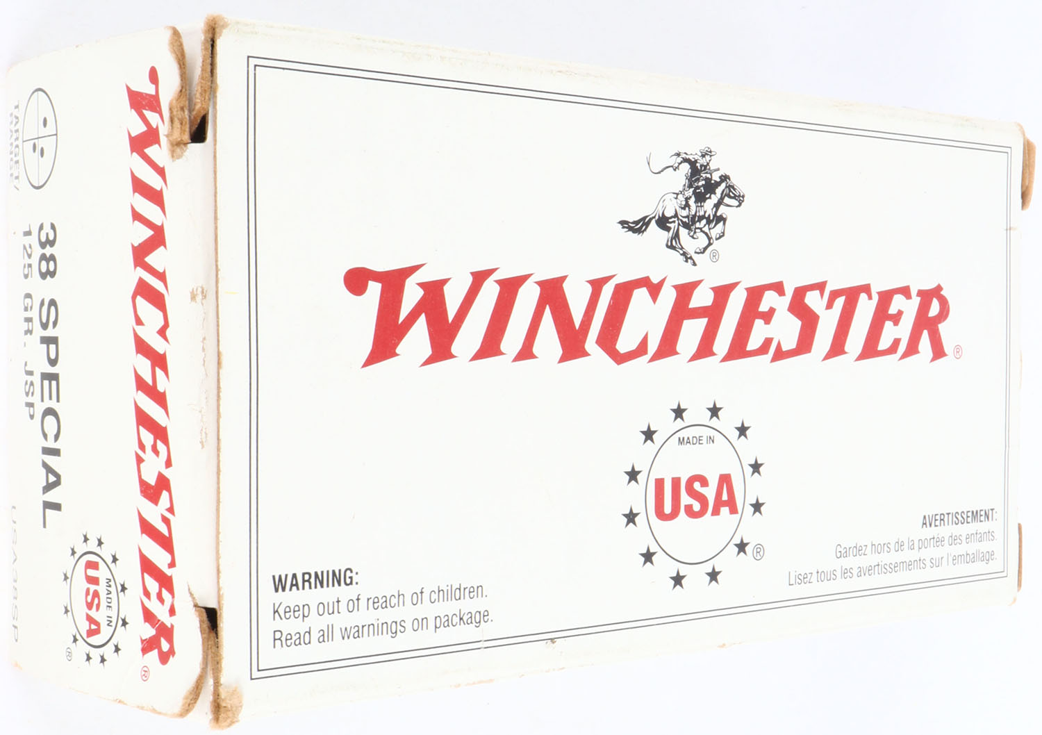 Winchester, .38 Special, 125 Grain Jacketed Soft Point, Full, 1pc. White & red box, box is solid with minty color, very minor corner wear, edges are mostly crisp, end flaps are solid, ammo is excellent. Grade: Excellent ++ - Value: 20 to 60
