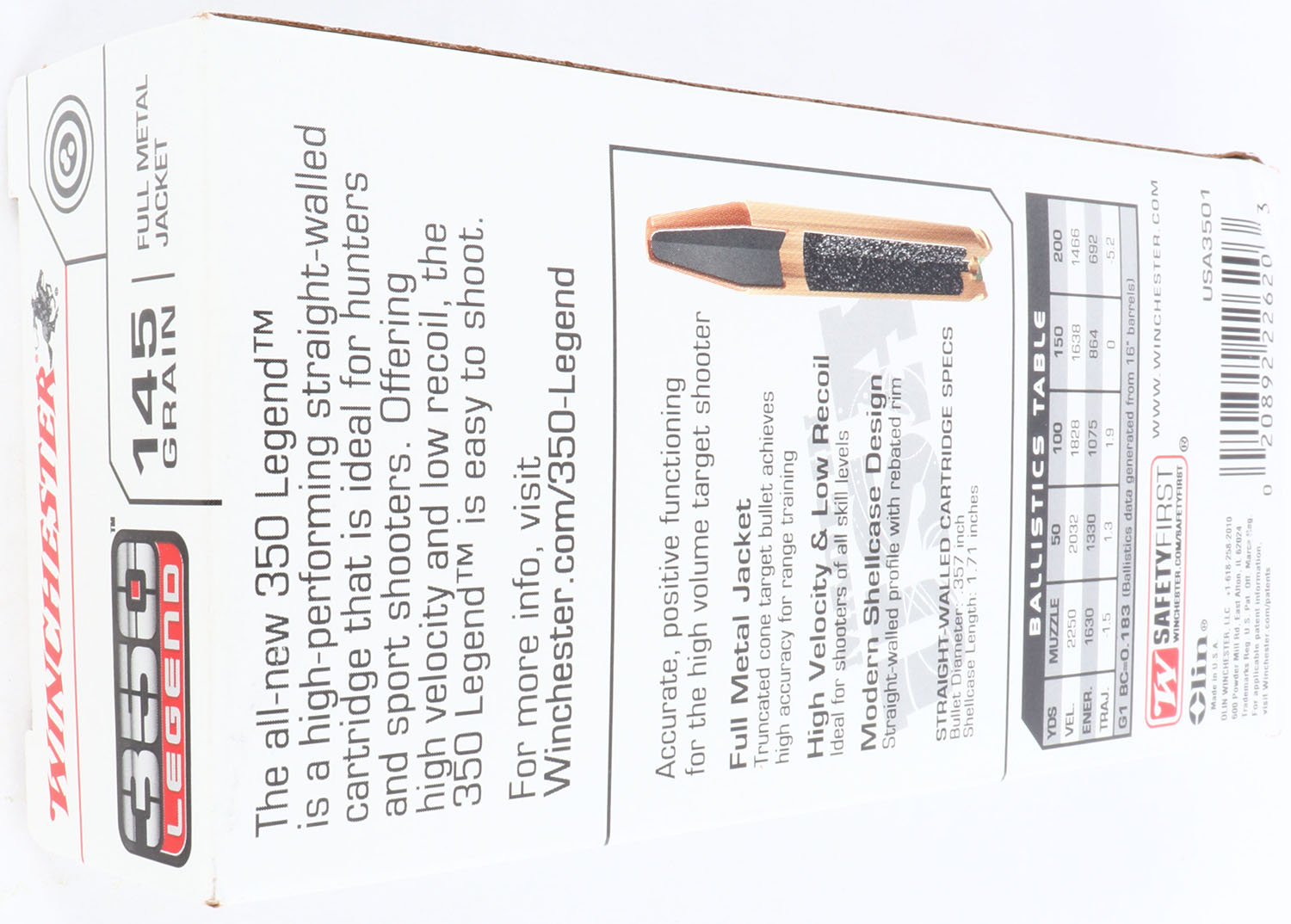 Winchester, Target, .350 Legend, 145 Grain Full Metal Jacket, Full, 1pc. White & red box, box is MINT with mint color, corners are sharp, edges are crisp, end flaps are solid, ammo is excellent. Grade: MINT - Value: 10 to 40