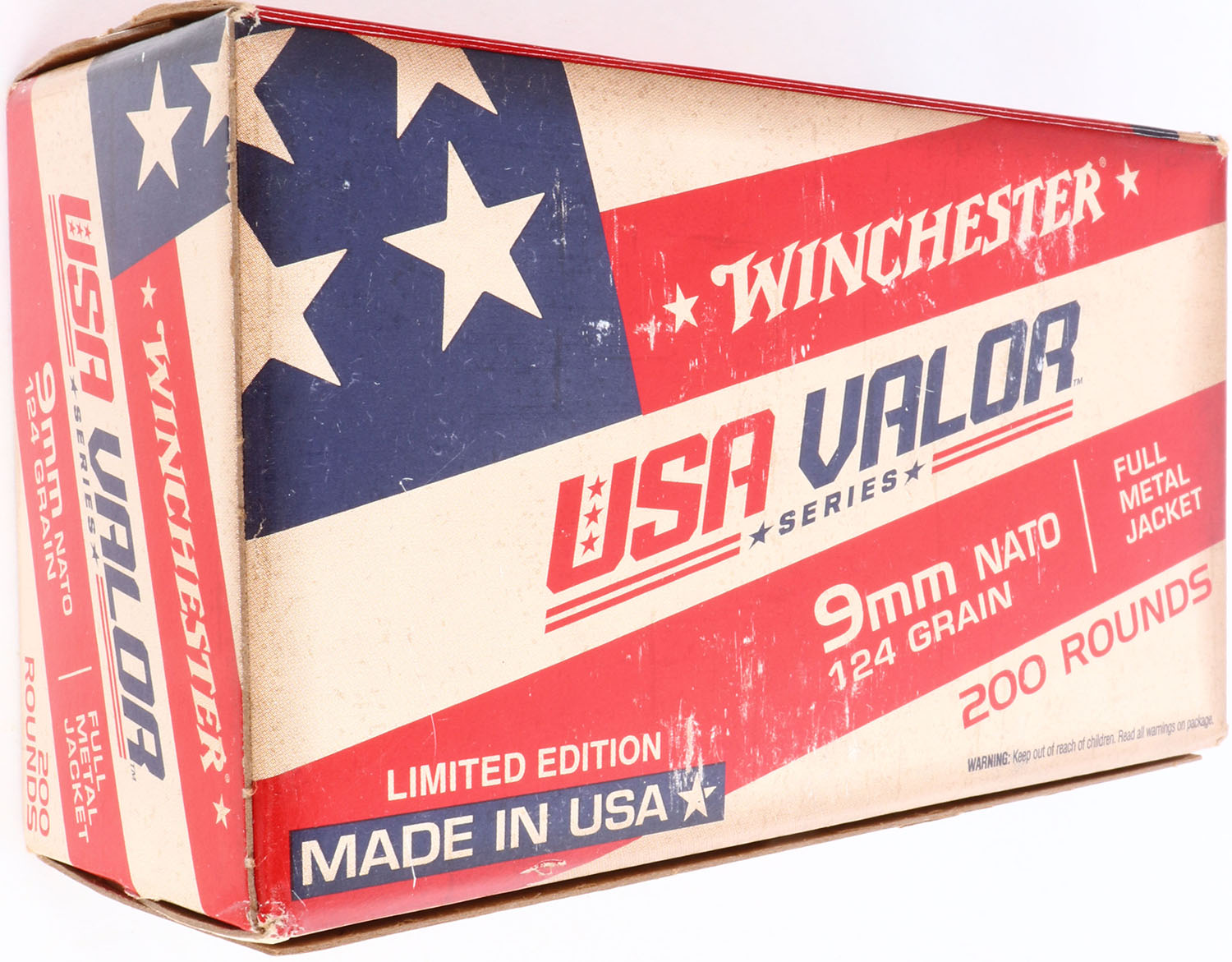 Winchester, USA Valor, 9mm Nato, 124 Grain Full Metal Jacket, FULL & SEALED, 200rds., 1pc. Tan red & blue box, box is near mint with minty color, corners are sharp, edges are crisp. Grade: Excellent ++ - Value: 30 to 90