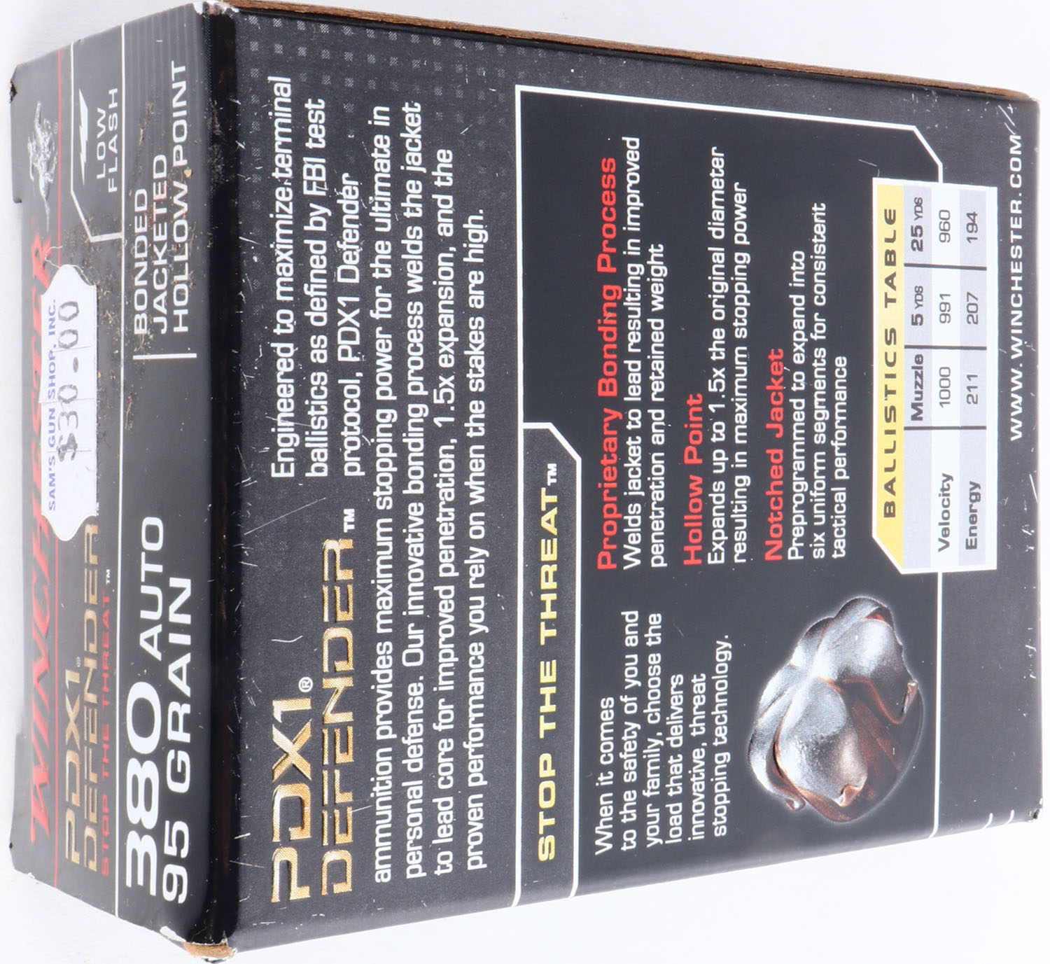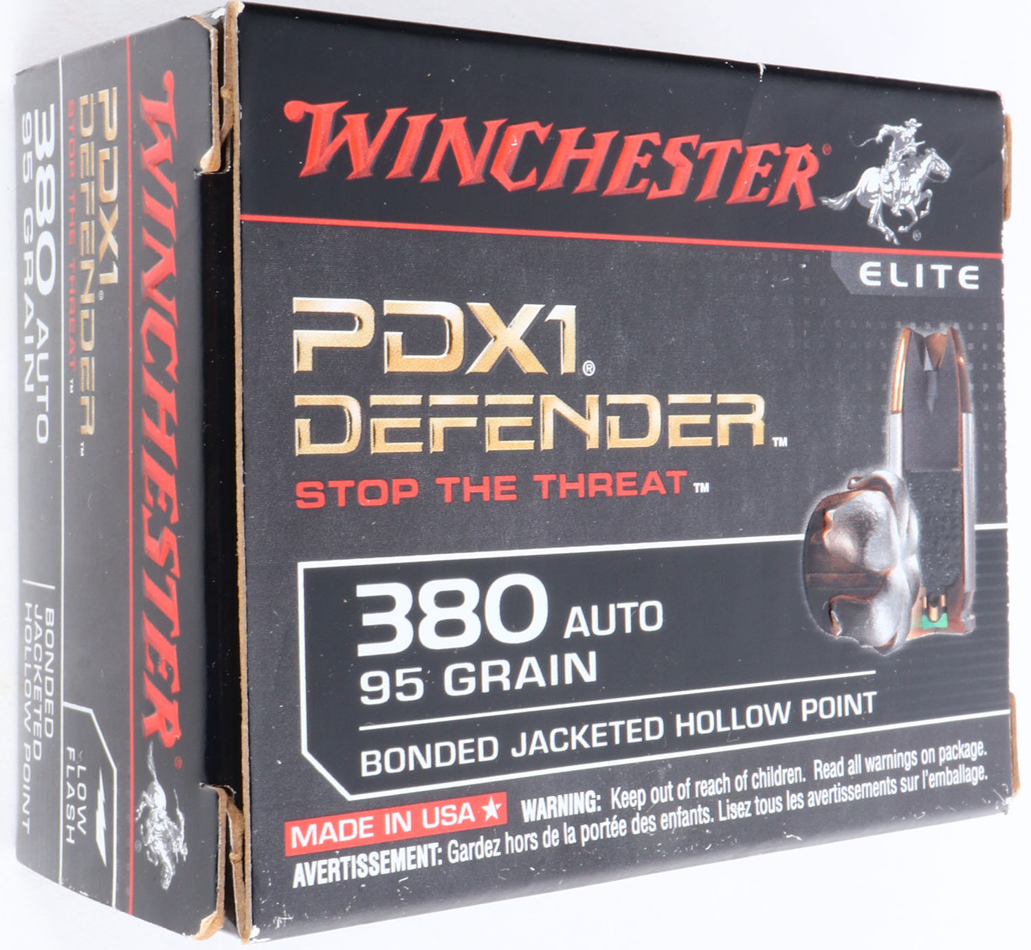 Winchester, PDX1 Defender, .380 Auto, 95 Grain Bonded Jacketed Hollow Point, Full, 1pc. Black box, box is near mint with mint color, only very minor corner wear, edges are crisp, end flaps are solid, ammo is excellent. Grade: Excellent ++ - Value: 10 to 40