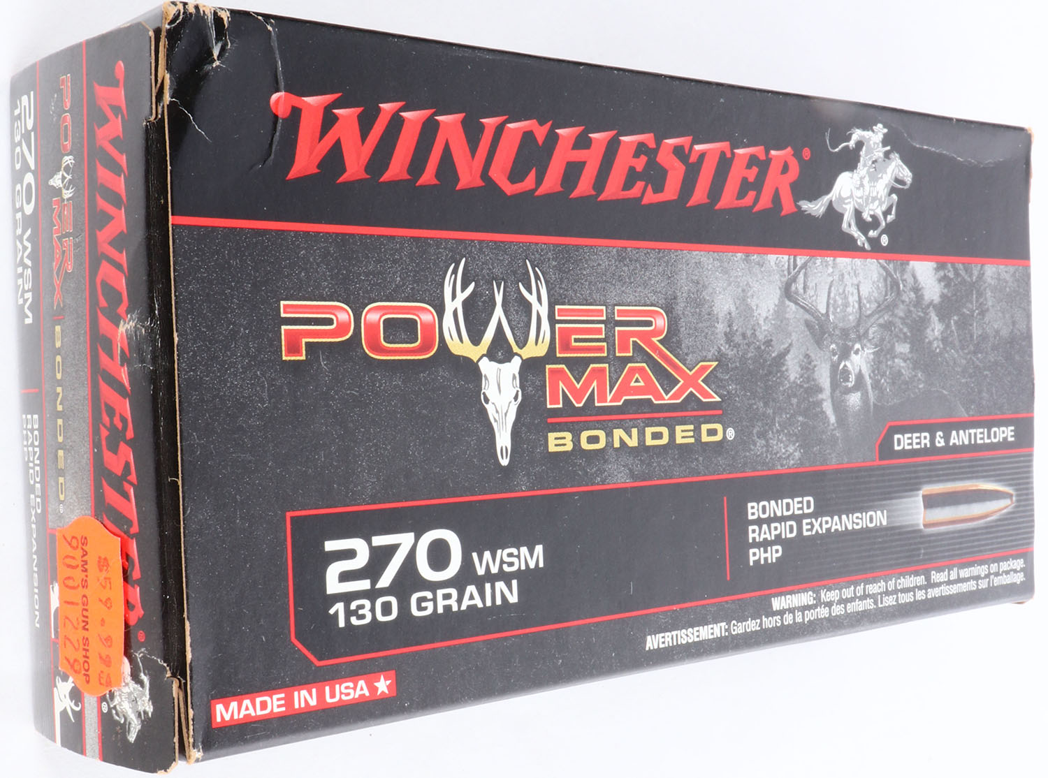 Winchester, Power Max, .270 WSM, 130 Grain Bonded Rapid Expansion PHP, Full, 1pc. Black & red box, box is solid with minty color, minor corner wear, edges are crisp, end flaps are solid, ammo is excellent. Grade: Excellent ++ - Value: 30 to 90