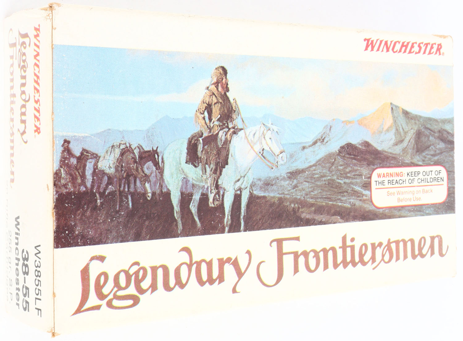 Winchester, Legendary Frontiersmen, .38-55 Winchester, 255 Grain Soft Point, Full, 1pc. Multi-colored box, box is solid with excellent color, very minor age soiling & corner wear, edges are crisp, end flaps are solid, ammo is excellent. Grade: Excellent ++ - Value: 30 to 90