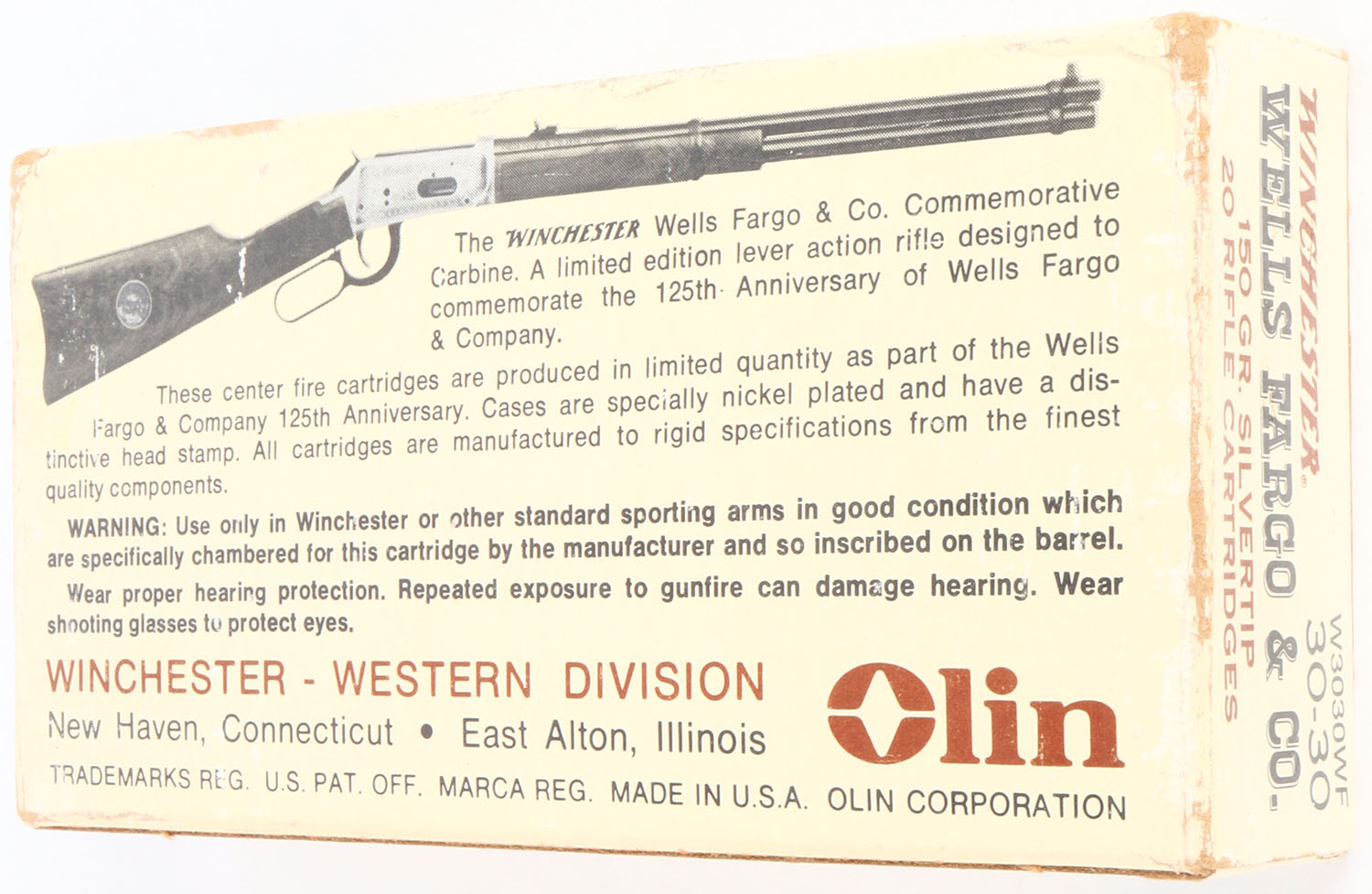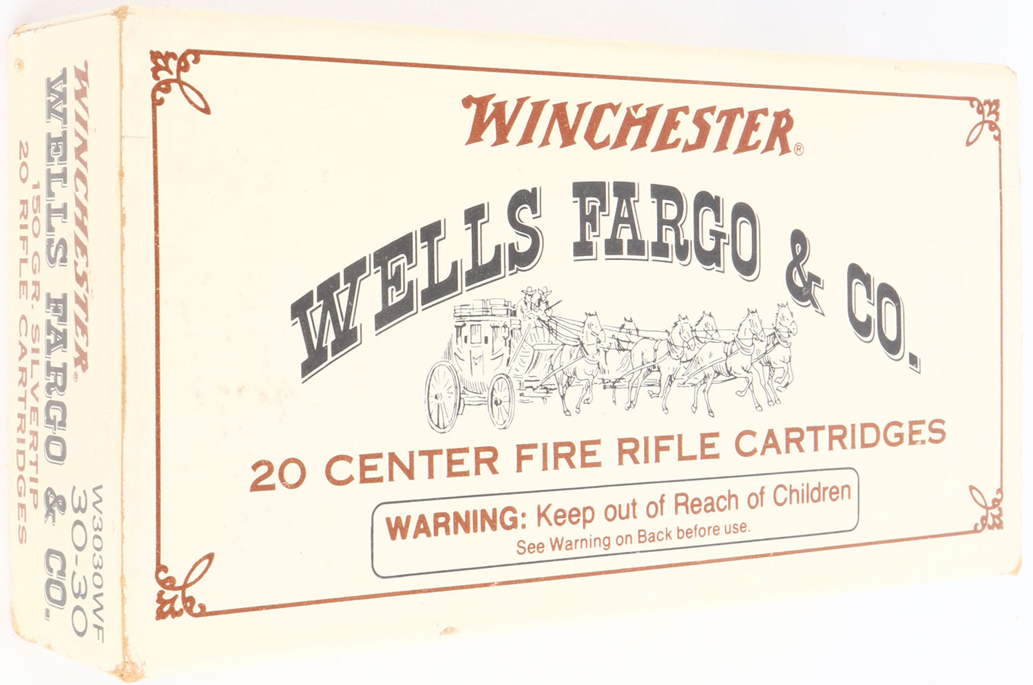 Winchester, Wells Fargo & Co., .30-30 Winchester, 150 Grain Silvertip, Full, 1pc. Tan brown & black box, box is solid with excellent color, very minor age soiling & corner wear, edges are crisp, end flaps are solid, ammo is excellent. Grade: Excellent ++ - Value: 30 to 90