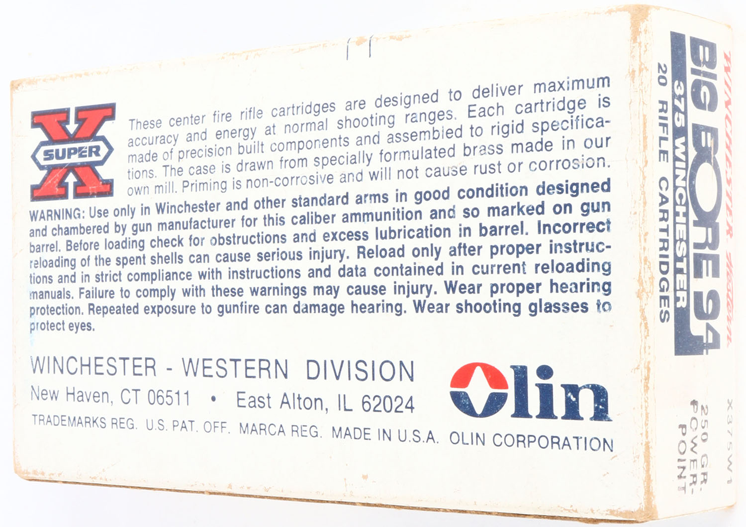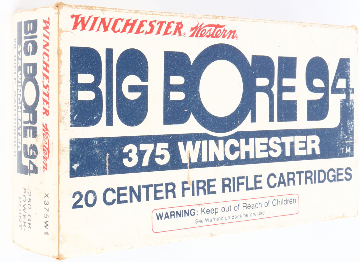 Winchester-Western, Big Bore 94, .375 Winchester, 250 Grain Power-Point, Full, 1pc. White blue & red box, box is solid with very good to excellent color, minor shelf wear, some edge & corner wear, end flaps are solid, ammo is excellent. Grade: Excellent - Value: 50 to 150