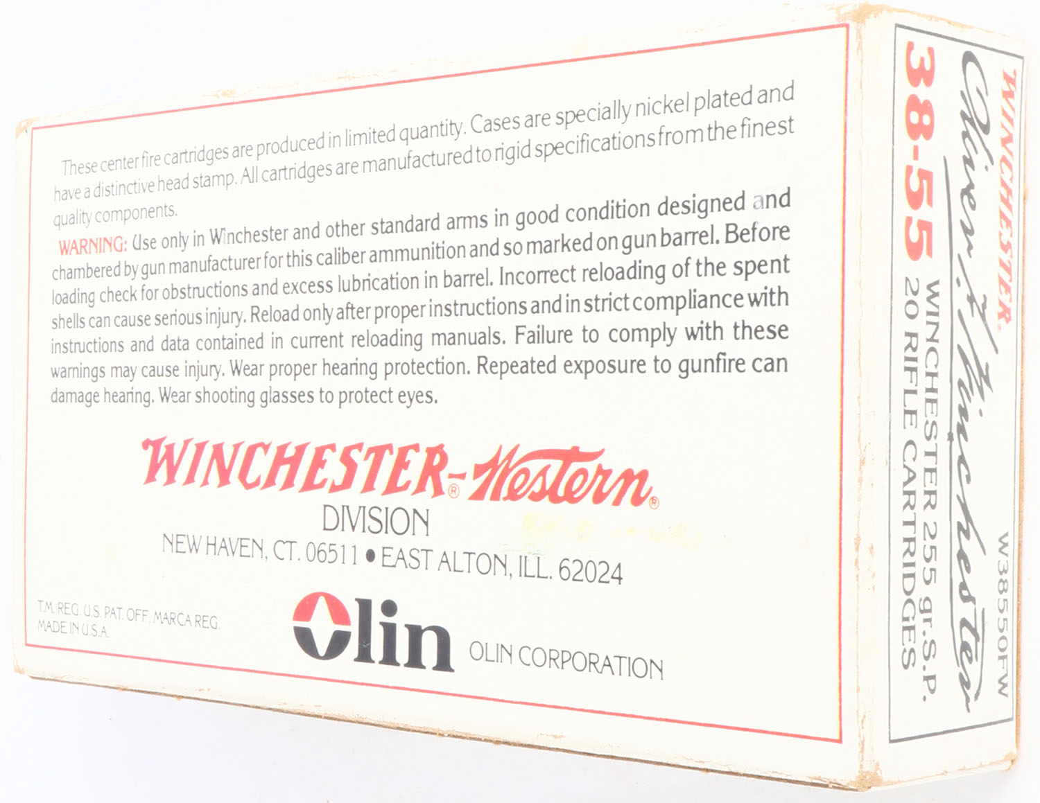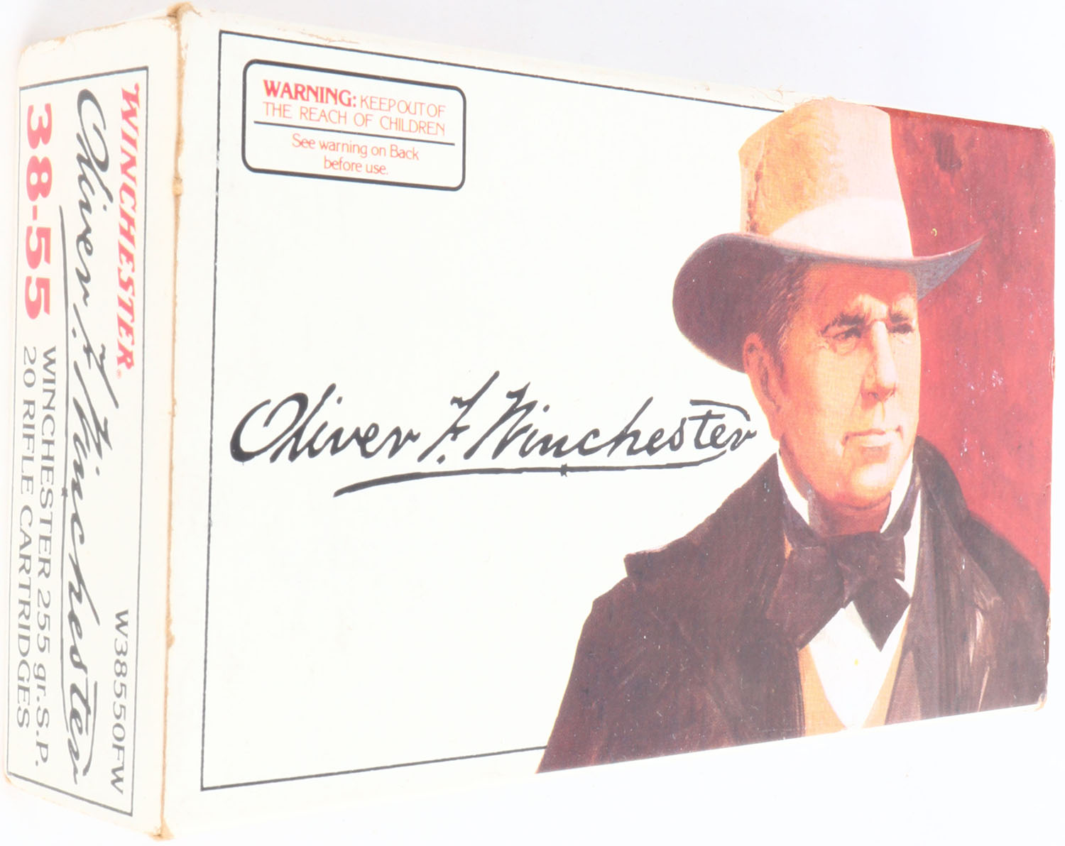 Winchester, Oliver F. Winchester, .38-55 Winchester, 255 Grain Soft Point, Full, 1pc. White box picturing Oliver Winchester, box is solid with excellent color, very minor shelf wear, corners are mostly sharp, edges are crisp, end flaps are solid, ammo is excellent. Grade: Excellent + - Value: 30 to 90