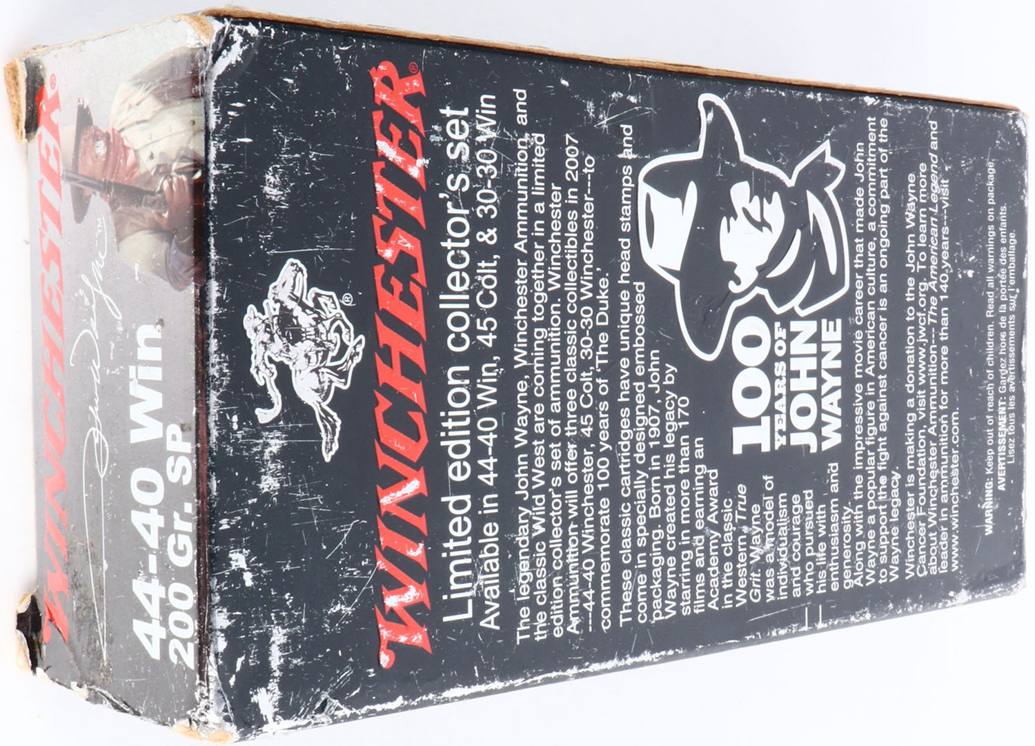Winchester, John Wayne, .44-40 Winchester, 200 Grain Soft Point, Full, 1pc. Black & silver box featuring The Duke, box is solid with excellent color, shelf wear, edge & corner wear, end flaps are solid, ammo is excellent. Grade: Very Good + - Value: 40 to 120