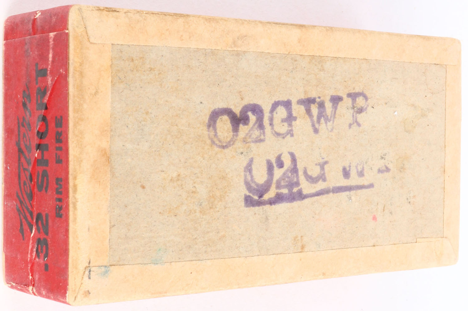 Western, Rim Fire Cartridges, .32 Short, Nublend Powder, 80 Grain Bullet, FULL & SEALED, 2pc. Buff box with green top & red side sealing labels, box is solid with excellent color, very minor age soiling & corner wear, edges are mostly crisp, labels are intact. Grade: Excellent + - Value: 50 to 150