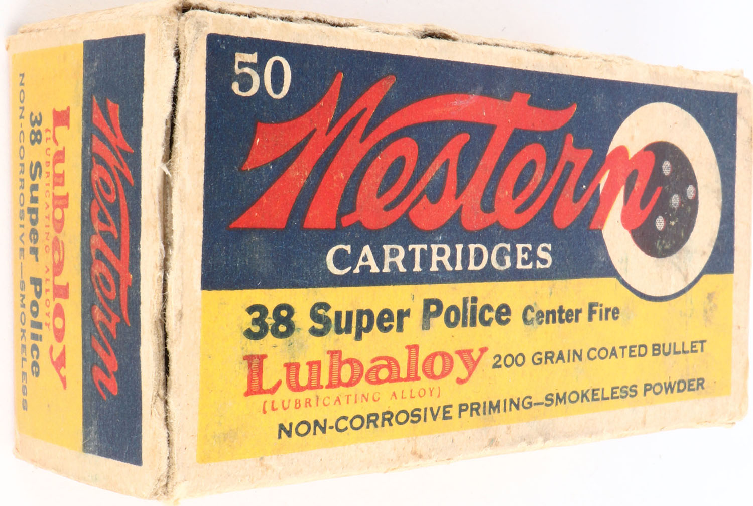 Western, Lubaloy, .38 Super Police, 200 Grain Coated Bullet, Partial 48rds. 1pc. Yellow blue & red bullseye box, left end flap is torn, partial seam split to back edge, box has very good to excellent color with some age soiling, minor shelf wear, some corner wear, minor edge wear, right end flap is solid, ammo is very good to excellent. Grade: Good ++ - Value: 20 to 60