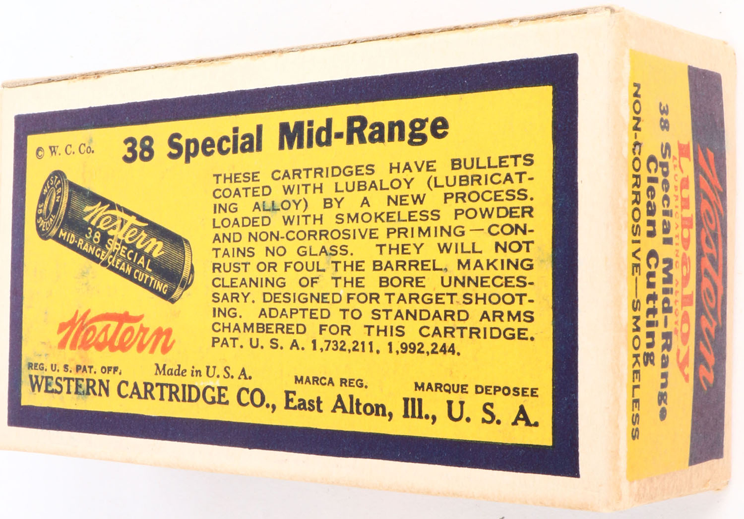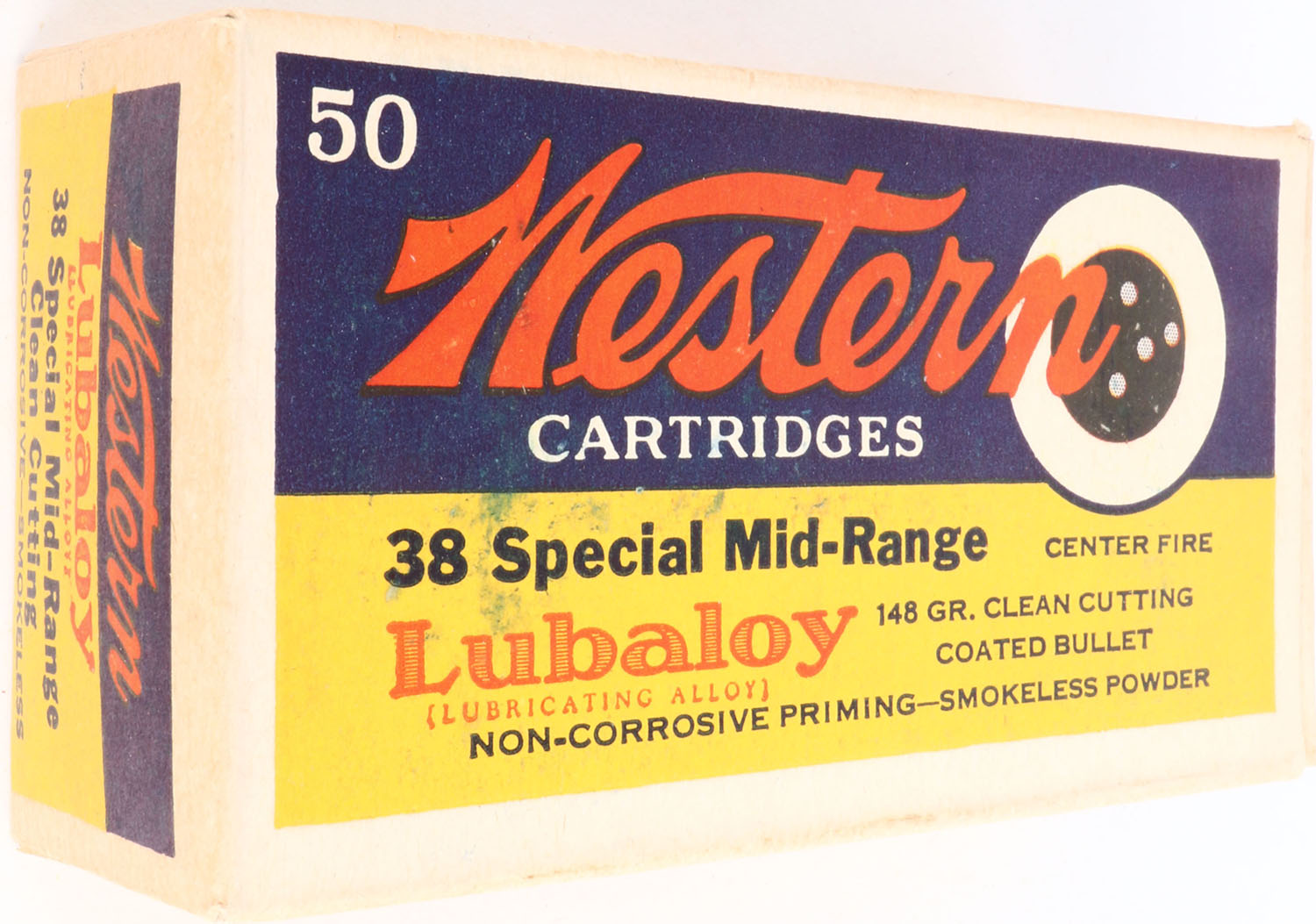 Western, Lubaloy, .38 Special Mid-Range, 148 Grain Clean Cutting Coated Bullet, Full, 1pc. Yellow blue & red First Issue 1930 bullseye box, box is near mint with excellent color, only very minor age soiling & color bleeding, corners are sharp, edges are crisp, end flaps are solid, ammo is very good. Grade: Excellent ++ - Value: 100 to 300
