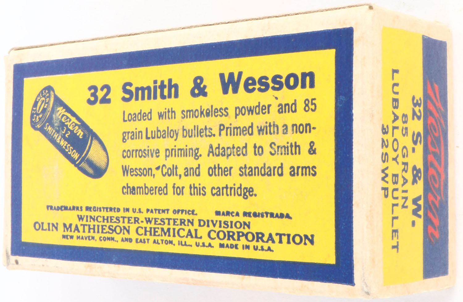 Western, Lubaloy, .32 Smith & Wesson, 85 Grain, Partial 49rds, 1pc. Yellow blue & red bullseye box, box is solid with minty color, minor corner wear, edges are mostly crisp, end flaps are solid, ammo is excellent. Grade: Excellent ++ - Value: 30 to 90