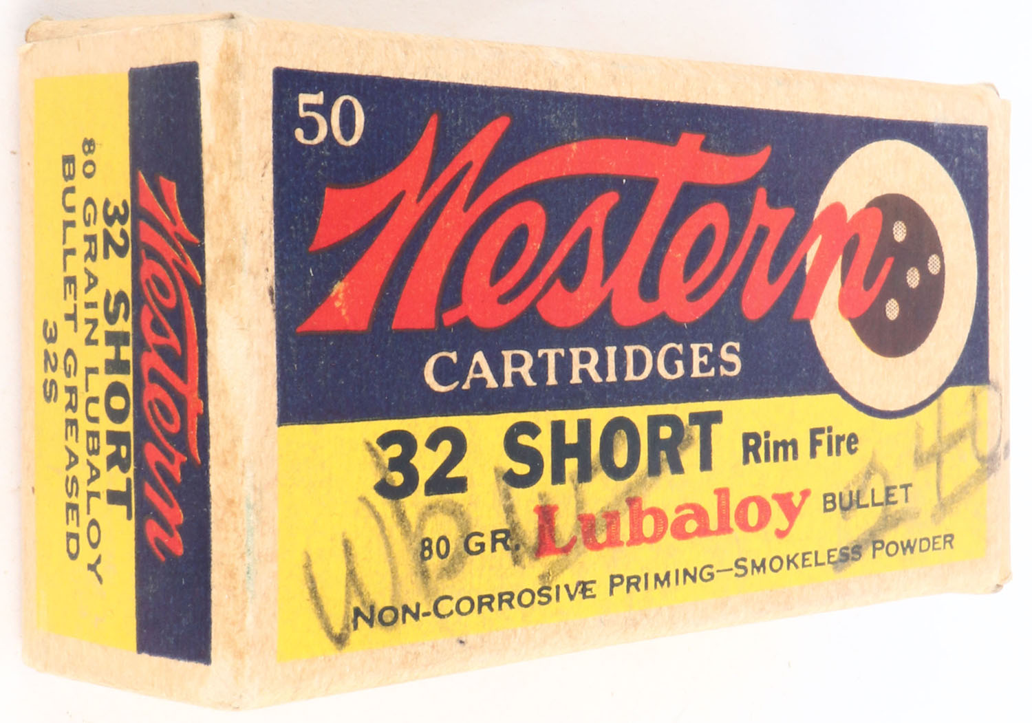 Western, Lubaloy, .32 Short Rim Fire, 80 Grain Bullet Greased, Full, 1pc. Yellow blue & red box, box is solid with excellent color, minor age soiling, top has been written on, very minor corner wear, edges are crisp, end flaps are solid, ammo is minty. Grade: Excellent + - Value: 80 to 240