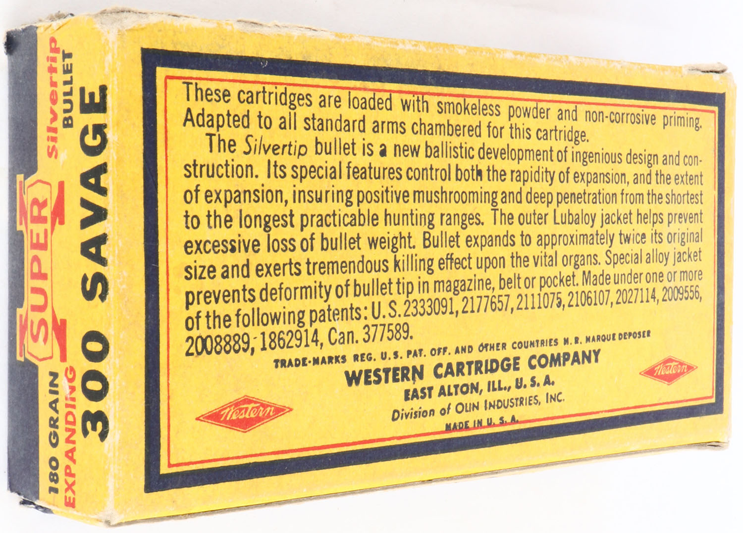 Western, Super-X Silvertip, .300 Savage, 180 Grain Controlled Expanding Bullet, Full, 1pc. Yellow blue & red bear box, box is solid with excellent color, minor age soiling & shelf wear, some corner wear, very minor edge wear, end flaps are solid, ammo is excellent. Grade: Excellent - Value: 20 to 60