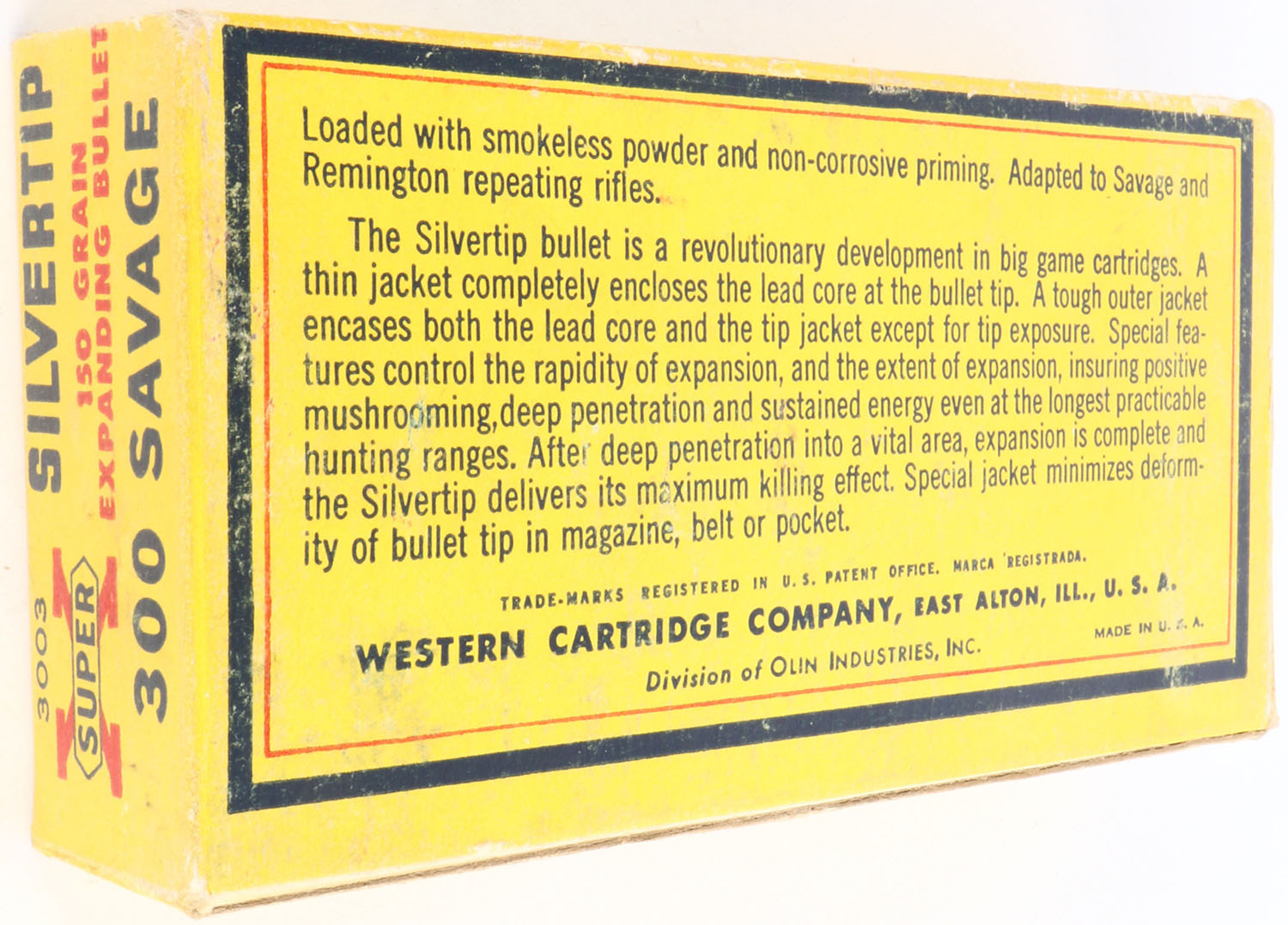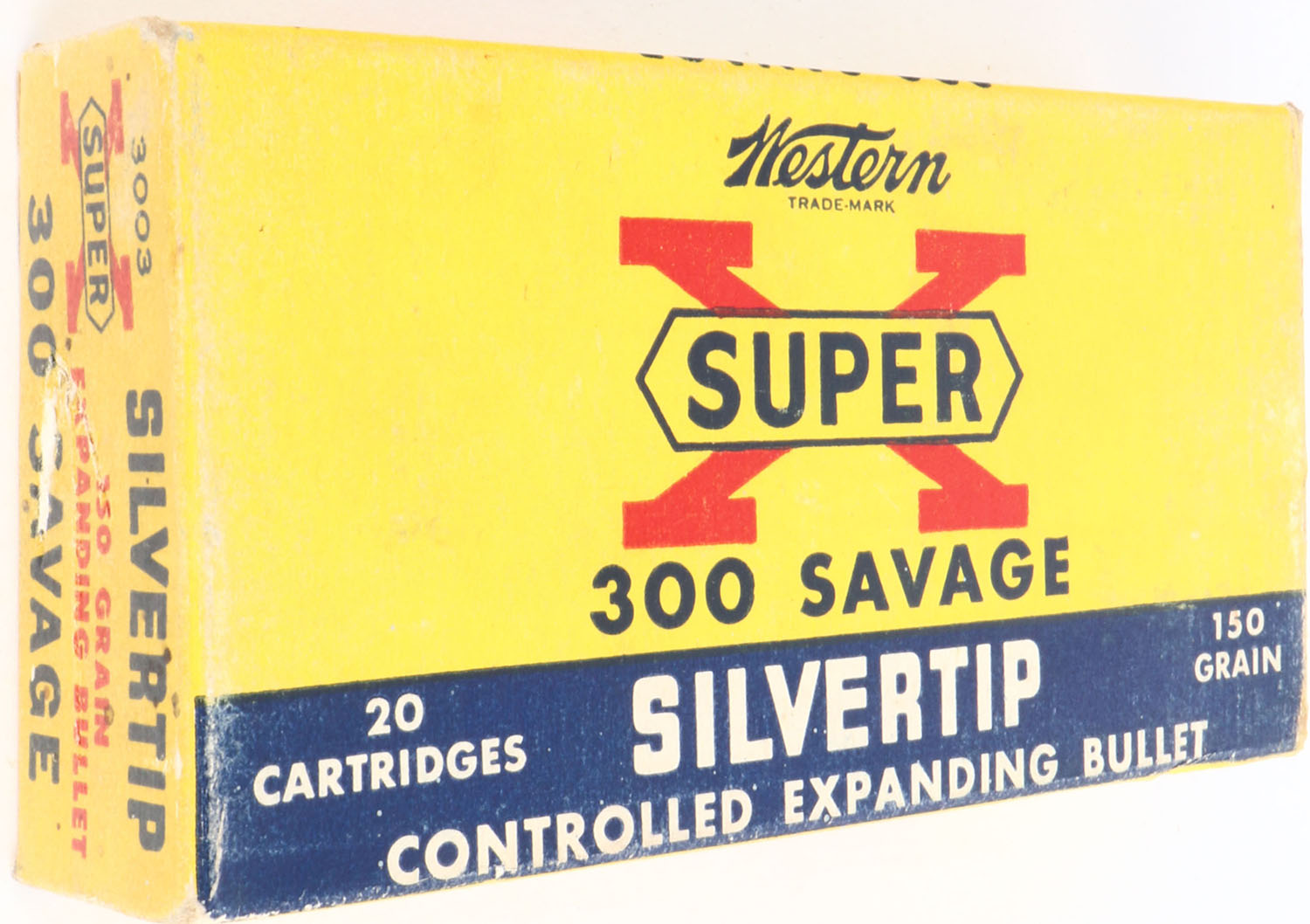 Western, Super-X Silvertip, .300 Savage, 150 Grain Controlled Expanding Bullet, Partial 18rds., 1pc. Yellow blue & red box, box is solid with excellent color, minor shelf wear, minor edge & corner wear, end flaps are solid, ammo is very good. Grade: Excellent + - Value: 10 to 50