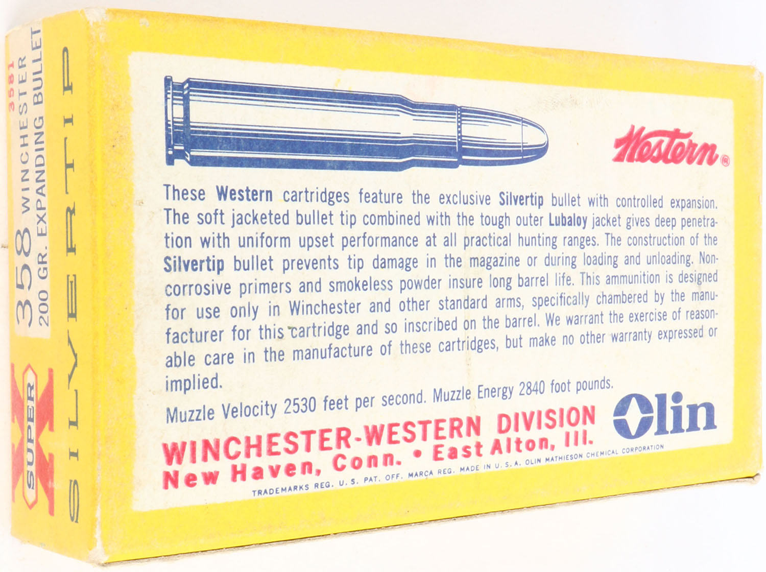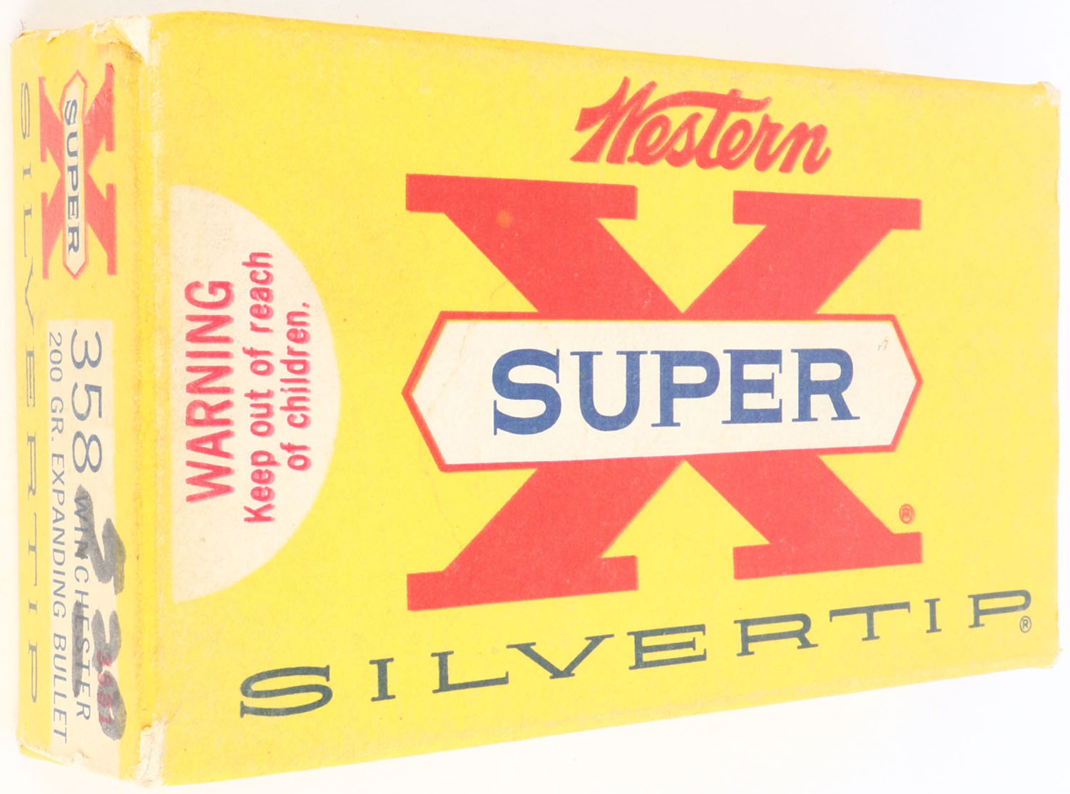 Western, Super-X Silvertip, .358 Winchester (8.8mm), 200 Grain Expanding Bullet, Full, 1pc. Yellow white & red box, box is solid with very good to excellent color, very minor age soiling & color fading, very minor corner wear, edges are mostly crisp, end flaps are solid, ammo is minty. Grade: Excellent + - Value: 20 to 60