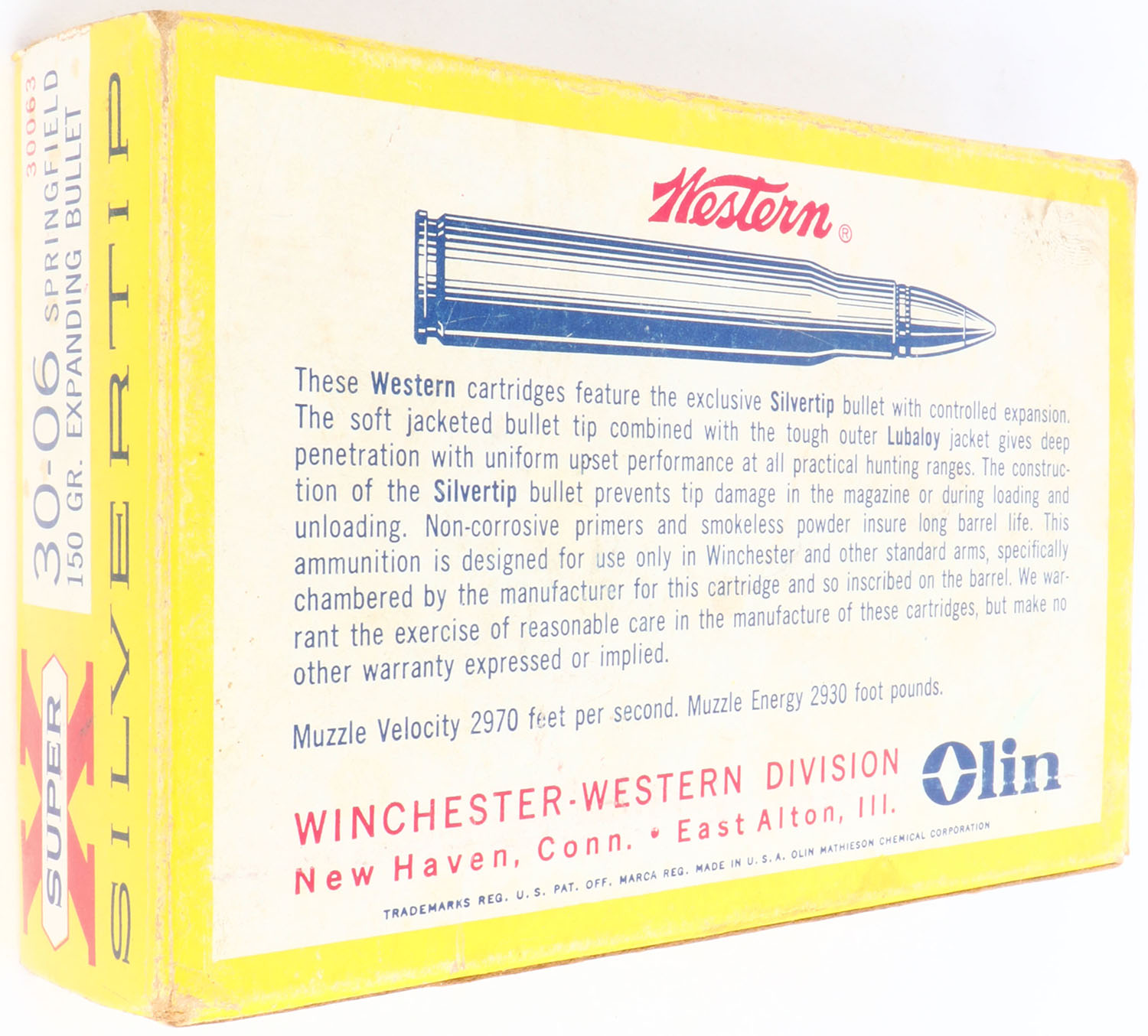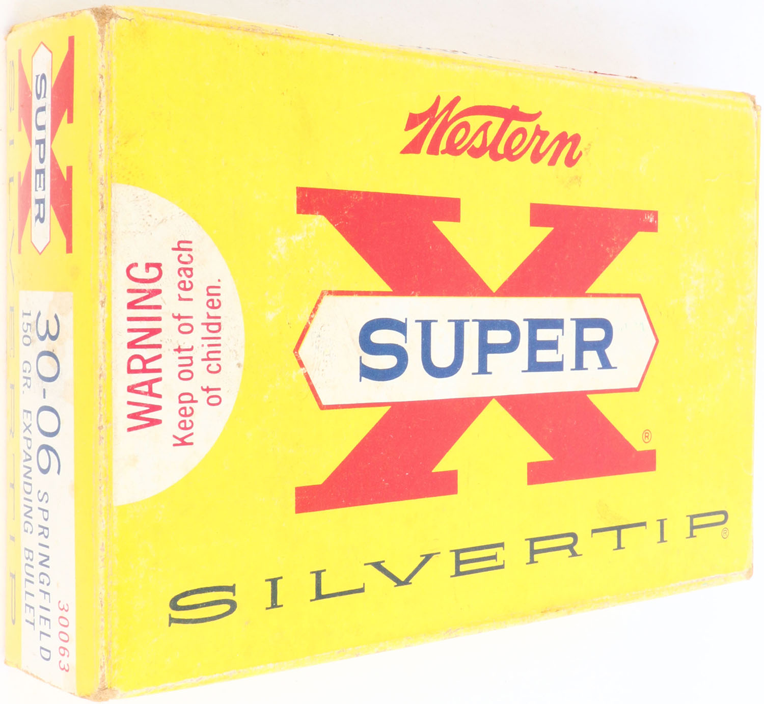 Western, Super-X Silvertip, .30-06 Springfield, 150 Grain Expanding Bullet, Full, 1pc. Yellow white & red box, box is solid with excellent color, minor shelf & corner wear, very minor edge wear, end flaps are solid, ammo is excellent. Grade: Excellent + - Value: 20 to 60