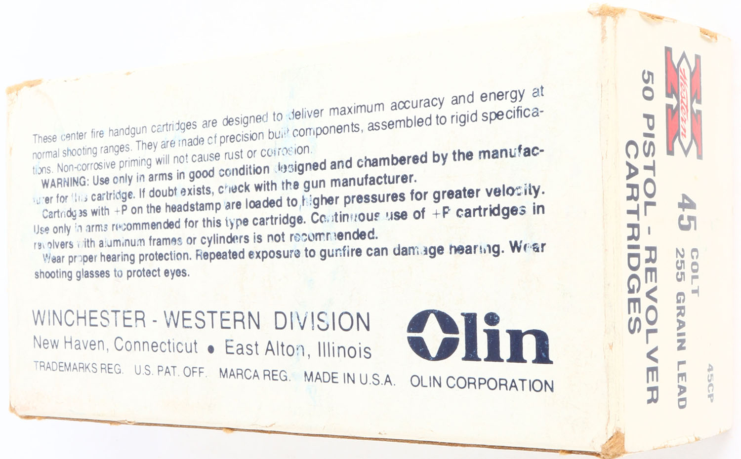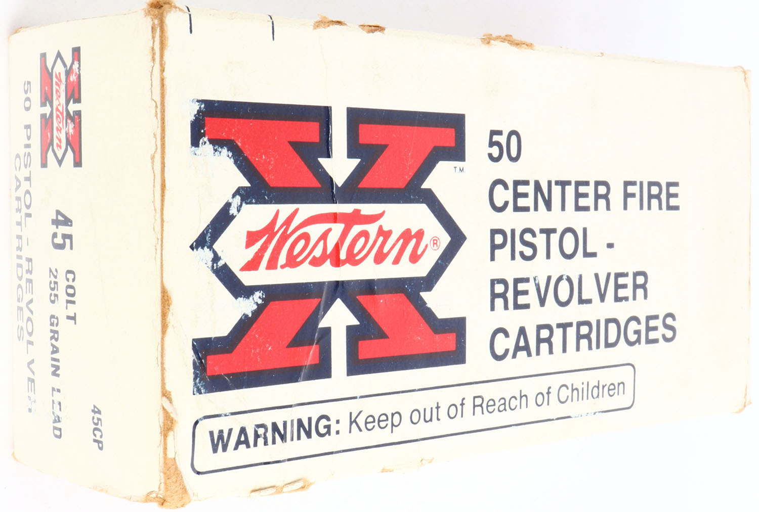 Western, X, .45 Colt, 255 Grain Lead, Full, 1pc. White & red box, box is solid with excellent color, very minor age soiling & shelf wear, some edge & corner wear, end flaps are solid, ammo is excellent. Grade: Excellent + - Value: 30 to 90