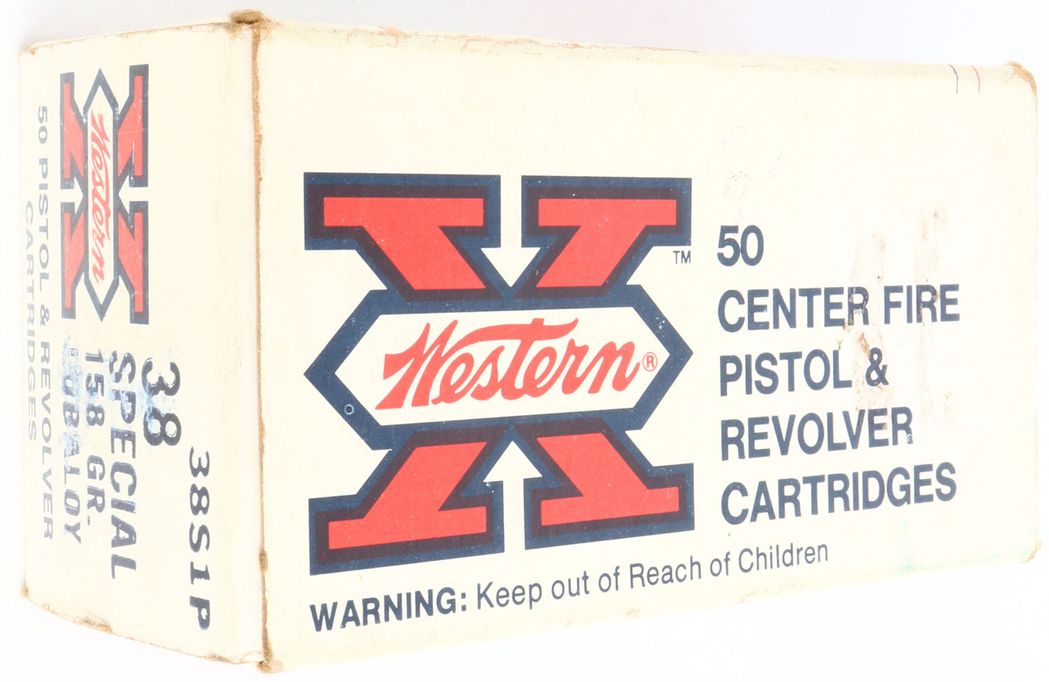 Western, X, .38 Special, 158 Grain Lubaloy, Full, 1pc. White & red box, box is solid with excellent color, very minor age soiling & shelf wear, minor corner wear, edges are mostly crisp, end flaps are solid, ammo is excellent. Grade: Excellent + - Value: 10 to 50
