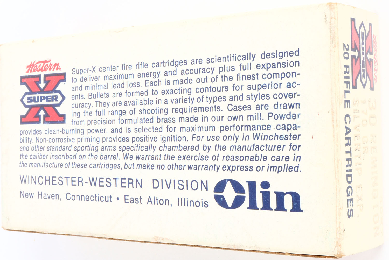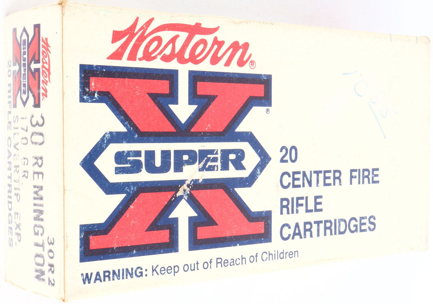 Western, Super-X, .30 Remington, 170 Grain Silvertip Expanding, Full, 1pc. White & red box, box is solid with excellent color, minor age soiling & shelf wear, very minor corner wear, edges are mostly crisp, top has been written on, end flaps are solid, ammo is excellent to minty. Grade: Excellent - Value: 30 to 90