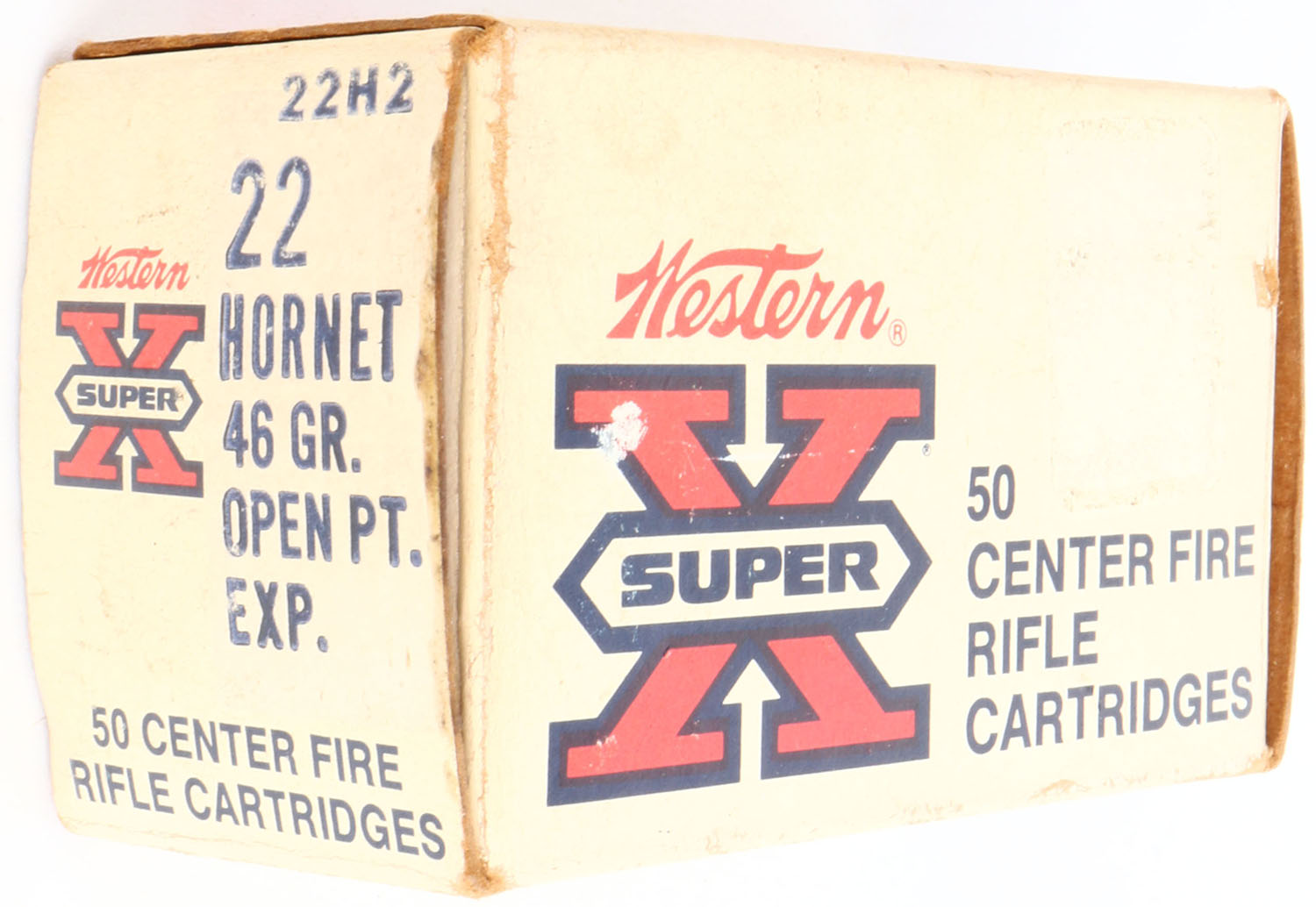 Western, Super-X, .22 Hornet, 46 Grain Open Point Expanding, Full, 1pc. White & red box, box is solid with good to very good color, age soiling, very minor corner wear, edges are mostly crisp, end flaps are solid, ammo is excellent. Grade: Excellent + - Value: 30 to 90